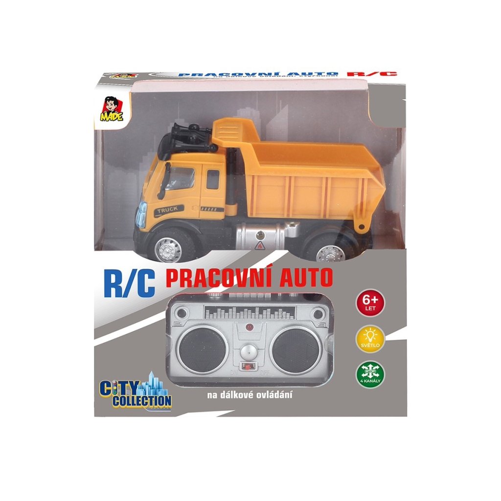 Auto stavební na dálkové ovládání z kolekce City collection. Ovladač v designu přenosného radiomagnetofonu. Auto jezdí dopředu, dozadu, vlevo a vpravo. Český box. Měřítko 1:64. Vhodné pro děti od 6 let. Světelné efekty.Napájení auto: baterie 2 x 1,5 V AA (nejsou součástí balení), ovladač: baterie 2 x 1,5 V AA (nejsou součástí balení). Auto obsahuje na spodní straně páčku jemného vyladění pohybu. Jestliľ se auto při jízdě vpřed vychyluje na jednu stranu, je moľné touto páčkou směr seřídit. Rozměry balení 19 x 16 x 6,5 cm.Doplňkové parametry
