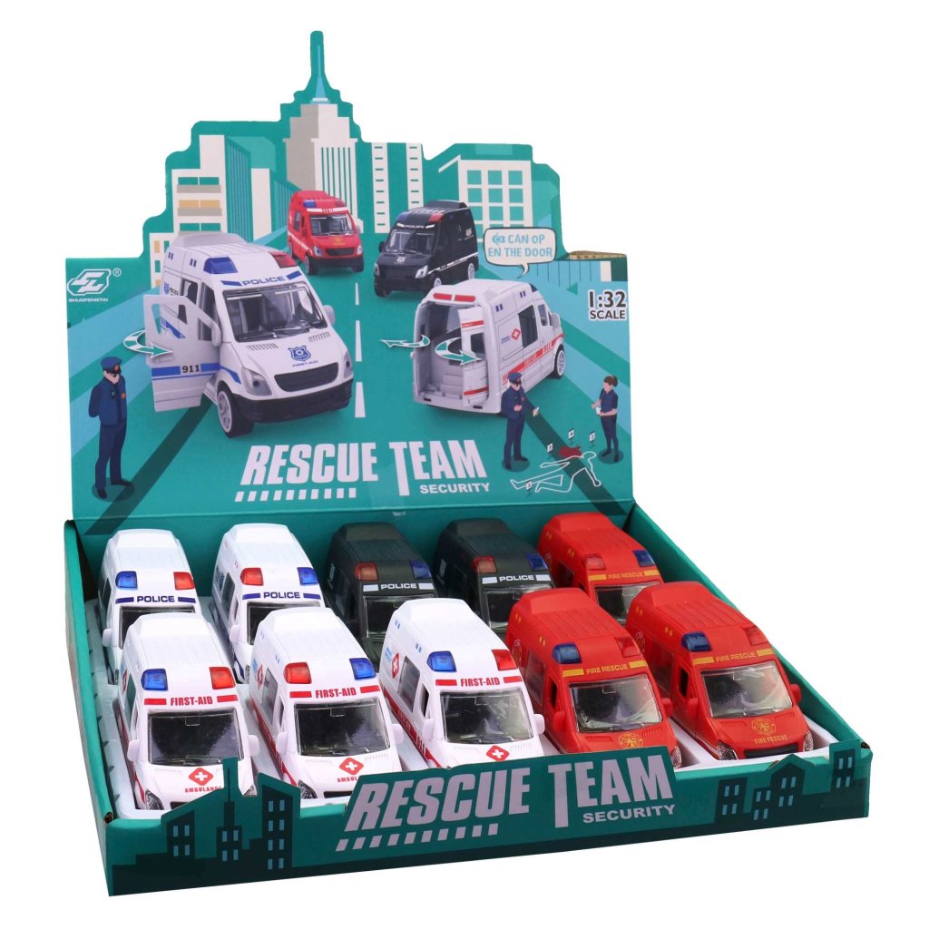Auta záchranná na setrvačník. Hračka je určena pro děti 3+. Rozměr hračky je 13,5 x 7 x 5. Materiál hračky je plast. Balení hračky je je display box 10ks Baterie nejsou součástí balení.