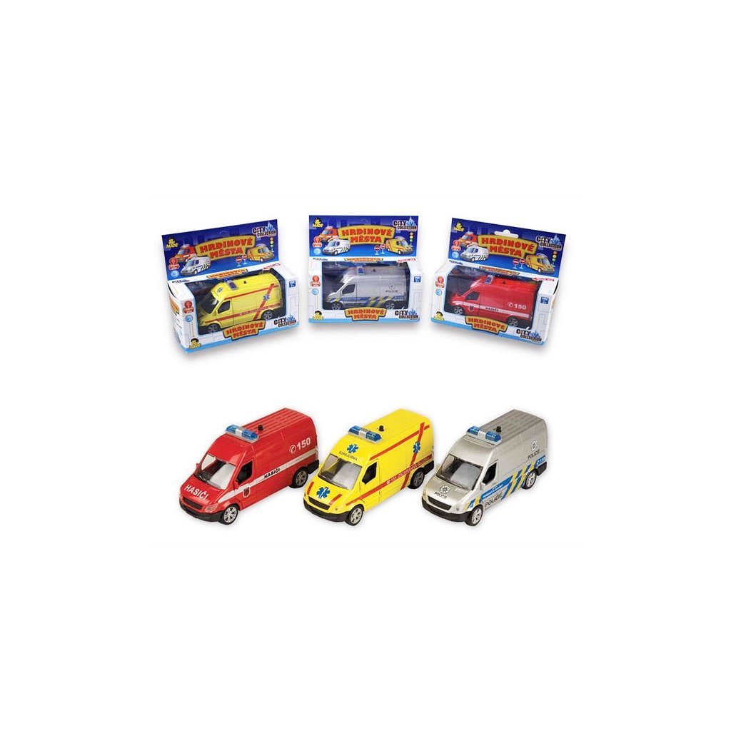Auto policejní na zpětné natažení se světlem a zvukem sirény. V nabídce je i hasičské nebo záchranářské auto. Cena je za kus.