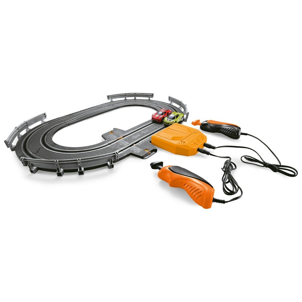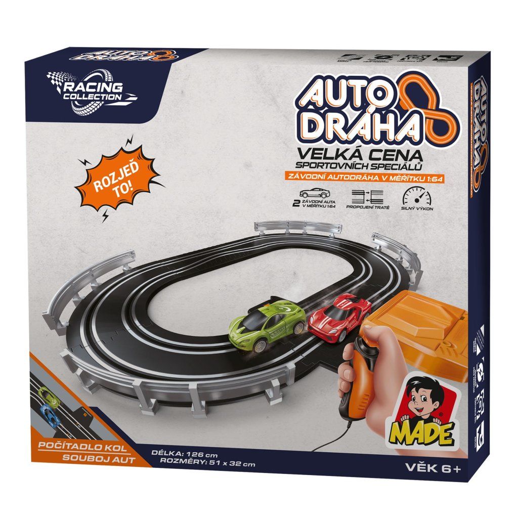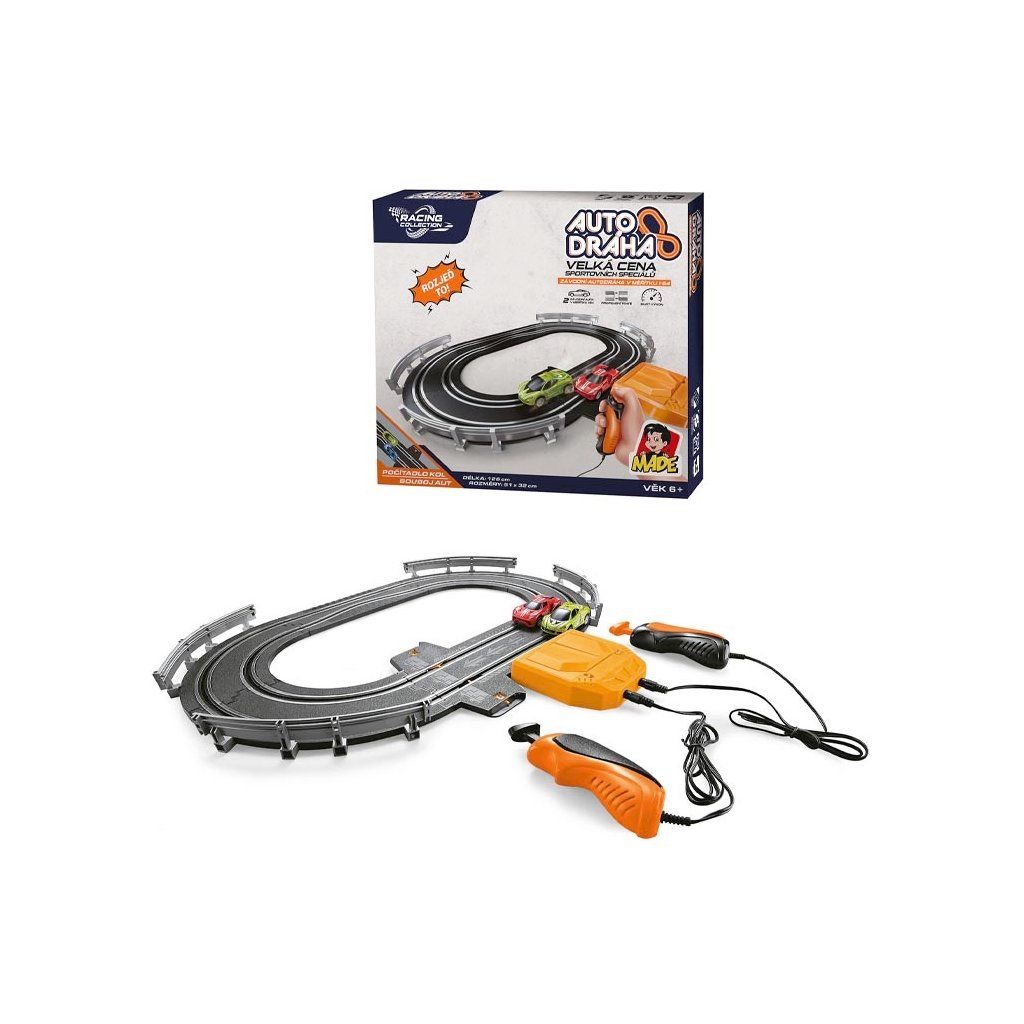 Autodráha, 34 x 30 x 5 cm. Skvělá autodráha pro všechny milovníky rychlé jízdy o celkové délce dráhy 126 cm. Stačí dráhu poskládat a závod může začít. Závodit se dá celkem na dvou tratích, které se ovládají 2 ovladači. Celý okruh závodu může znesnadnit několik prudkých zatáček a lopingů, ale správný závodník zvládne vše a dokáže si poradit. Balení obsahuje 2 různě barevná závodní auta, která barva bude ta tvá vítězná? Uvidíme v cíly.Technické specifikace :Délka tratě 126 cm, 2 autíčka, 2 ovladače.Rozměry dráhy: 51 x 32 cm při složení podle návodu.Rozměr balení: 34 x 30 x 5 cm.Měřítko: 1: 64Materiál: plast.Napájení: lze využít 6 x 1,5V AA baterie nejsou součástí balení, nebo síťový adaptér, který je součástí balení.Doporučený věk: 6 +Doplňkové parametry