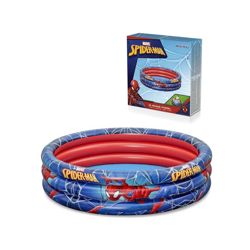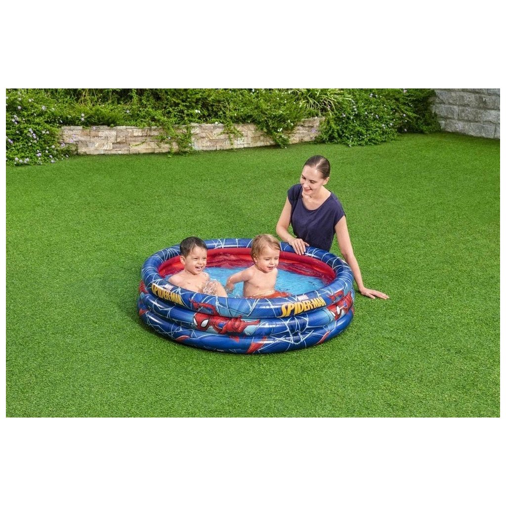 Spider-Man, který je ústředním motivem grafické potisku bazénu se už těší na den plný šplouchání, dobrodružství a smíchu ve vodě. 3 stejné prstence, které tvoří bazén, se dají snadno nafouknout. Široké stěny poskytují stabilitu a oporu pro dětské hry. Na konci sezóny může být voda vypuštěna pomocí snadno použitelného vypouštěcího ventilu. br Vhodné pro děti od 2 let. br Velikost 122 x 30 cm br Pojistné ventily br Robustní, předem otestován vinyl br Kapacita vody 200 lDoplňkové parametry