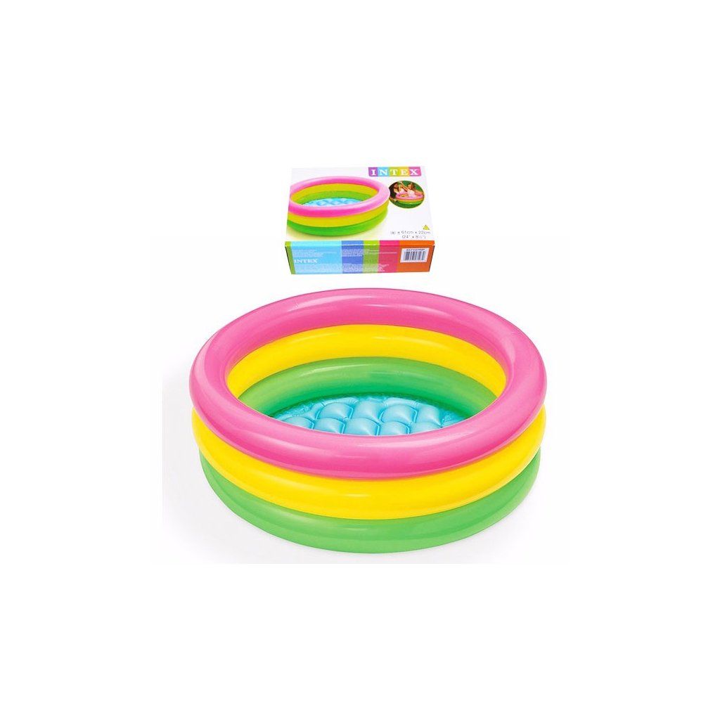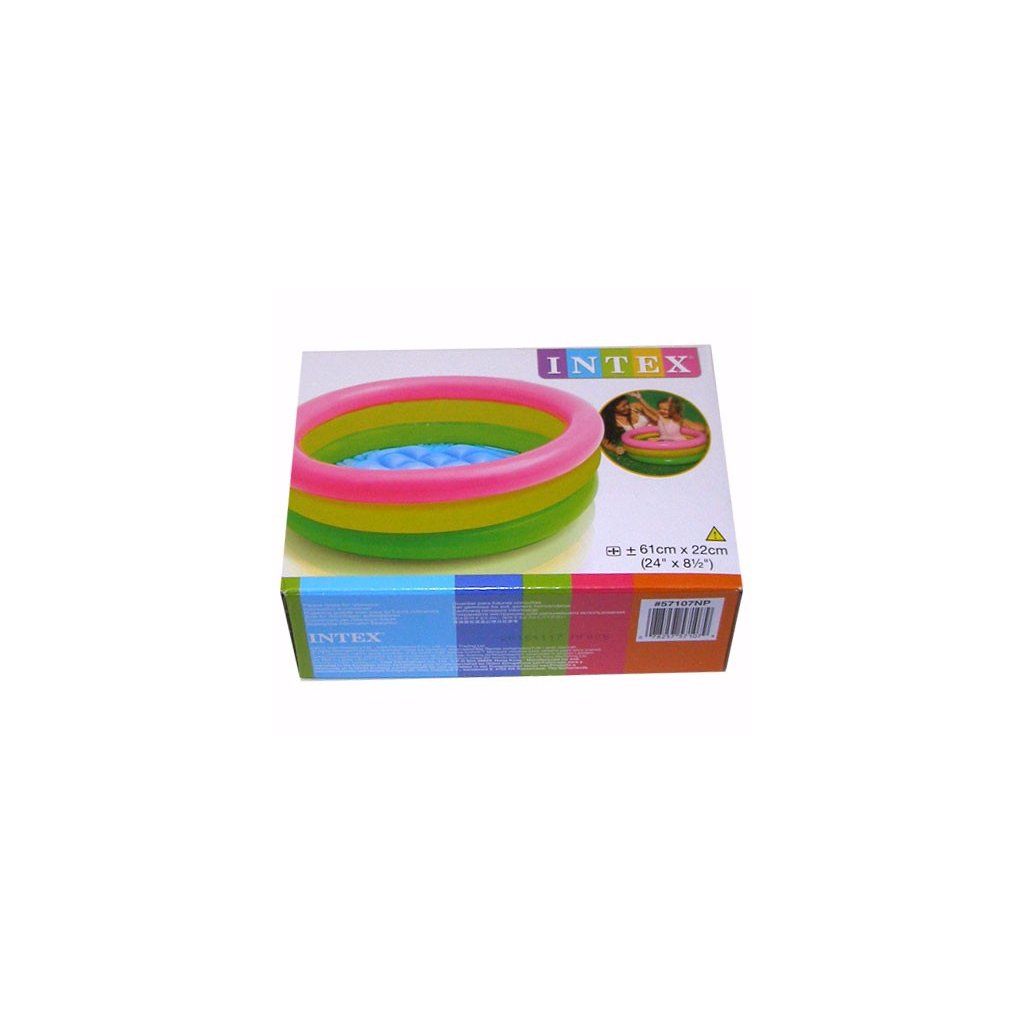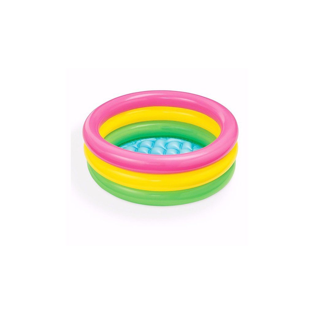 Bazén tříbarevný s průměrem 61 cm a výškou 22 cm se třemi komorami, vhodný na měkký travnatý povrch. Děti v něm nikdy nenechávejte bez dozoru.