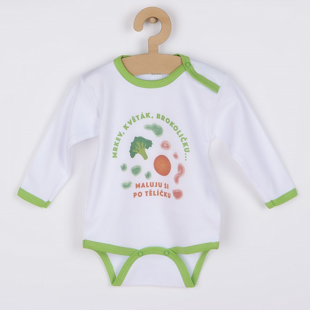 Originální bavlněné kojenecké body s dlouhým rukávem New Baby, s vtipným nápisem Mrkev, květák, brokoličku ... maluju si po tělíčku. Body má kolem krčku, nožiček a ručiček barevné lemování. Barvy použité k potisku jsou certifikované a vhodné pro miminka. Je vyrobeno z příjemného a kvalitního materiálu, ve kterém se bude Vaše miminko cítit příjemně. Body má zapínáni na cvočky na ramínku a mezi nožičkami, což usnadňuje oblékání a přebalování. Dopřejte Vašemu miminku vyniknout v originálním body. Složení: 100% bavlna. Rozměry: obvod kolem hrudníku cca 36 cm, délka rukávu cca 18 cm, celková délka cca 32 cm.Produkt české značky