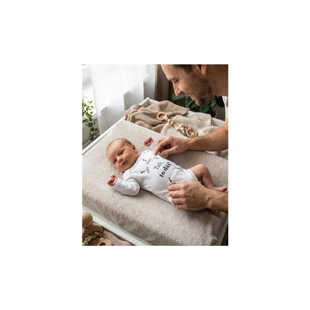 Originální bavlněné kojenecké body s dlouhým rukávem New Baby, s vtipným nápisem Tati, to dáš! Barvy použité k potisku jsou certifikované a vhodné pro miminka. Je vyrobeno z příjemného a kvalitního materiálu, ve kterém se bude Vaše miminko cítit příjemně. Body má zapínáni na cvočky na ramínku a mezi nožičkami, což usnadňuje oblékání a přebalování. Dopřejte Vašemu miminku vyniknout v originálním body. Složení: 100% bavlna. Rozměry: obvod kolem hrudníku cca 42 cm, délka rukávu cca 23 cm, celková délka cca 38 cm.Produkt české značky