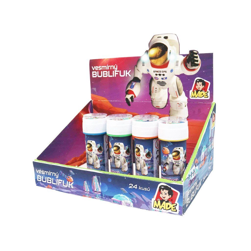 Bublifuk astronaut má objem 50ml. Na výběr ze čtyř barev. Baleno po 24 kusech. Cena je za 1 kus. Vhodné pro děti 3+.