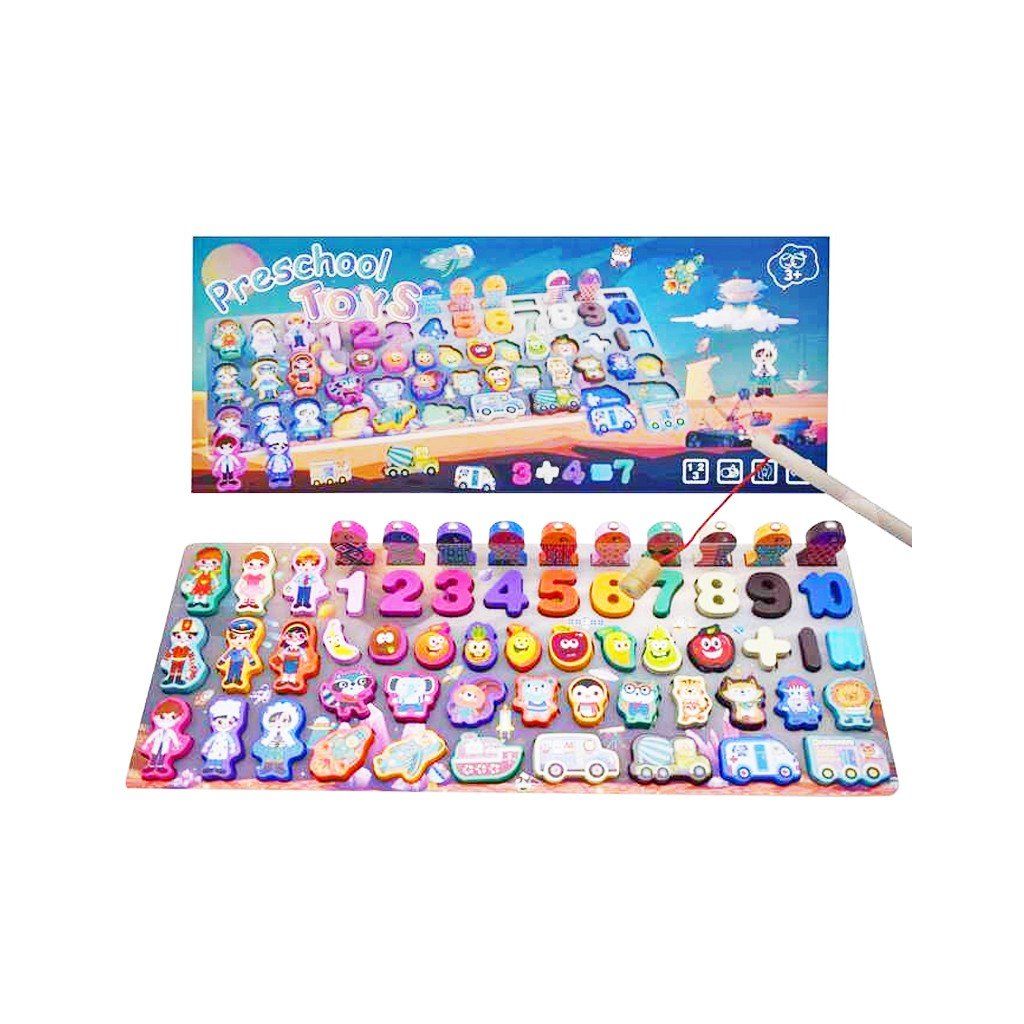 Naučná dřevěná hra, má rozměry 45x18 cm. Vhodné také jako pomůcka k procvičení angličtiny. Balení obsahuje barevné rybičky s čísly, udici, čísla, postavičky představující jednotlivé povolání, zvířátka a ovoce ke vkládání. Cena je za balení. Nevhodné pro děti do 3 let.Doplňkové parametry
