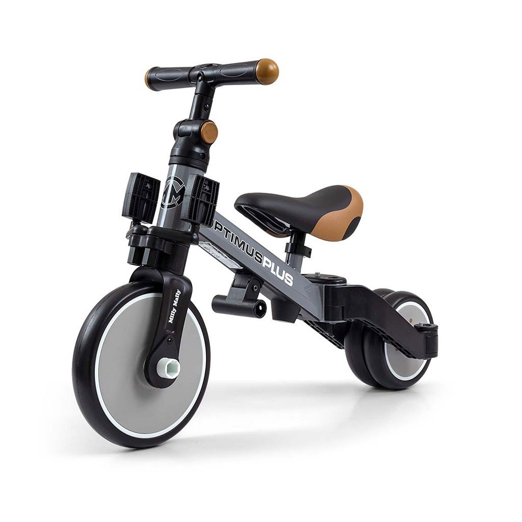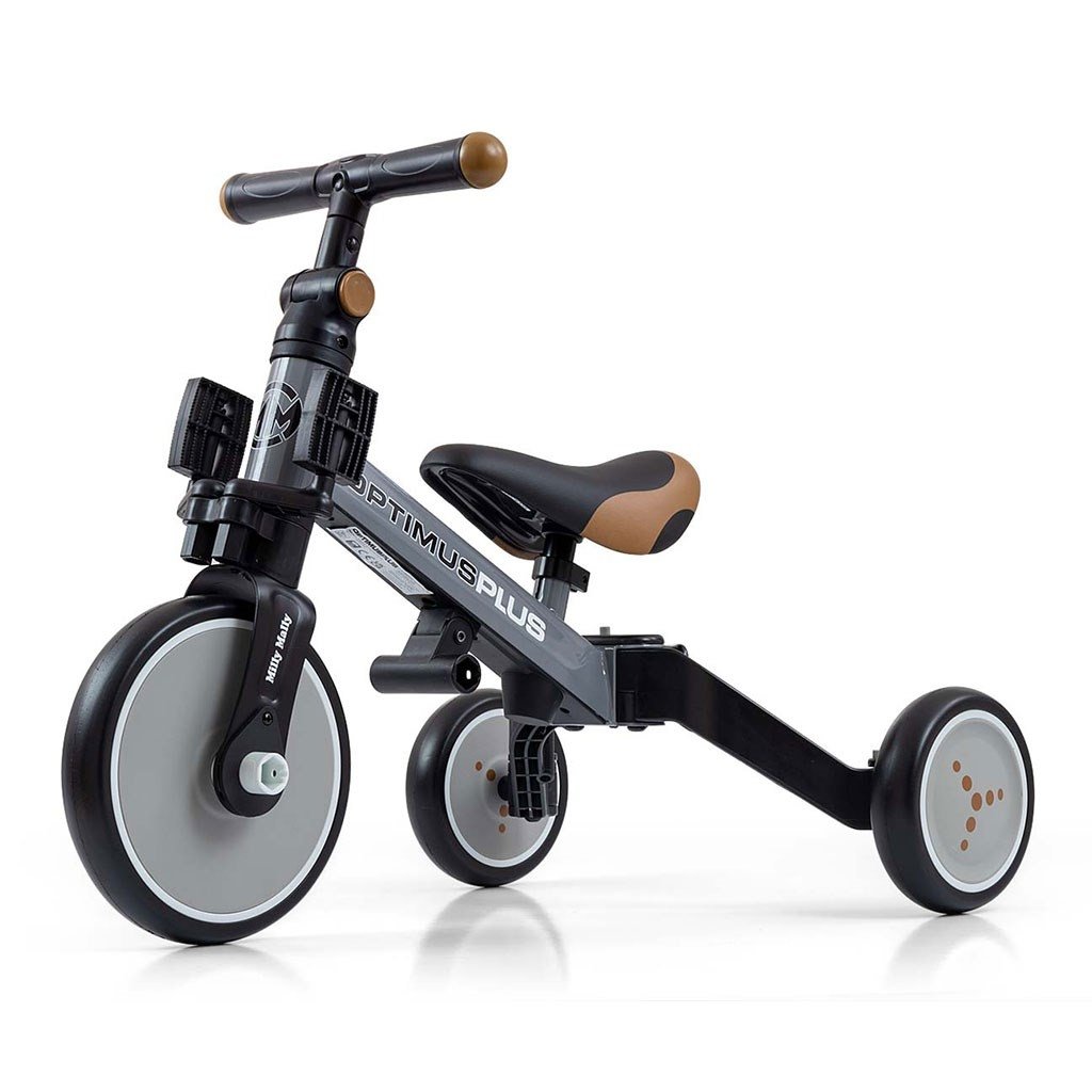 Univerzální dětská šlapací tříkolka Milly Mally 4v1 Optimus byla navržena tak, aby se stala tím nejlepším co můžete nabídnout svému malému závodníkovi. Díky stabilní konstrukci poskytuje dítěti maximální úroveň bezpečnosti a tímto mu usnadňuje získávání nových dovedností. Největší výhodou této tříkolky je její variabilita. Jakmile dítě získá základy jízdy, připojíme pedály nebo jí během okamžiku změníme na klasické jednostopé odrážedlo. Pěnová kola výborně absorbují rázy, poskytují dobrou přilnavost, zajistí pohodlí během jízdy a neunaví vašeho malého závodníka. Dostatečný rozvor kol poskytuje mimořádnou stabilitu, bezpečnost během používání doma i venku. Doraz nedovolí přetočení řídítek.