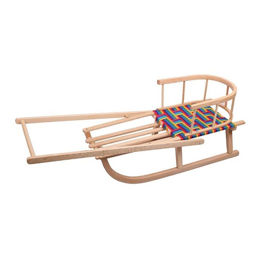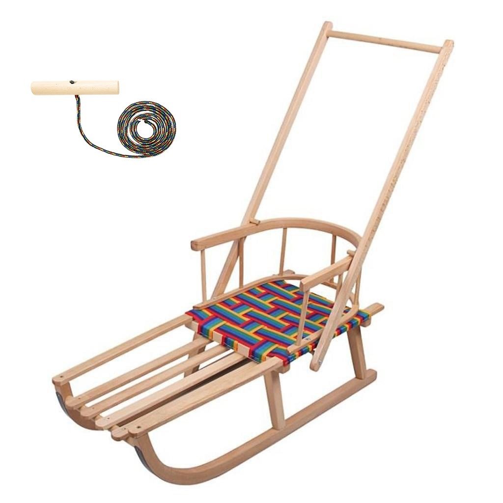 Dětské dřevěné sáňky české značky New Baby s rukojetí pro děti. Vyrobeny z bukového dřeva, určené pro rekreační sáňkování. Sedadlo je vyplétané textilními nepromokavými popruhy. Spodní část je opatřena ocelovou skluznicí.
