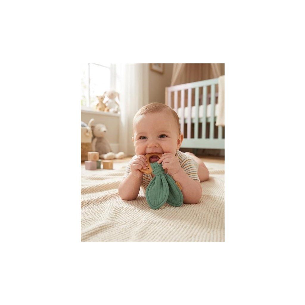 Kousátko s mušelínovou plenou je ideální sada, když se dítěti prořezávají zoubky. Kousátko je vyrobeno z bukového dřeva šetrného ke středu a měkké mušelínové látky. Zcela bezpečné pro děti přináší uklidňující úlevu při prořezávání zoubků. Kousátko lze použít také jako hračku pro miminka. Kousátko se dokonale hodí k našim dalším mušelínovým výrobkům a vytváří tak krásnou sadu, kterou lze darovat na dětskou oslavu.