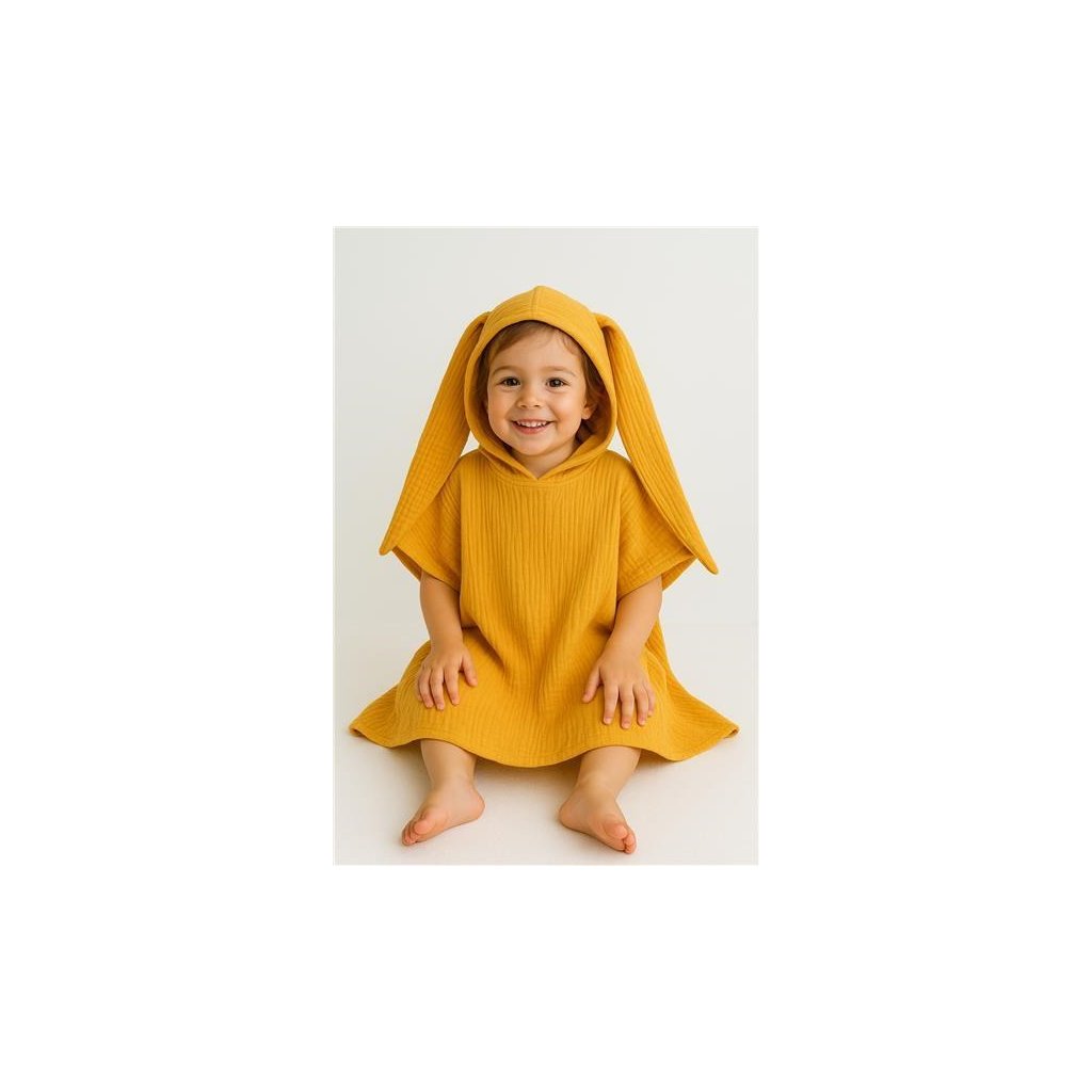 Dětské mušelínové pončo New Baby Feeling. Stylové pončo nejen na doma, ale i na plavání u bazénku, nebo u vody. Mušelínové pončo je díky materiálu lehké, vzdušné a krásně savé. Pončo bude chránit dítě před chladem a poslouží i jako jemná osuška. Díky volnému jedinečnému střihu a roztomilým ouškám udělá dětem velkou radost. Svým střihem s děťátkem poroste a padne na každou postavu. Vypadá skvěle a lze využívat po celý rok. Pro snazší oblékání a svlékání jsou na boku cvočky. Tím vznikne možnost provést otvor na ruku, nebo nechat střih volný. Složení: mušelín-100% bavlna. Rozměr: 35 cm bez kapuce, šířka: 40 cm.