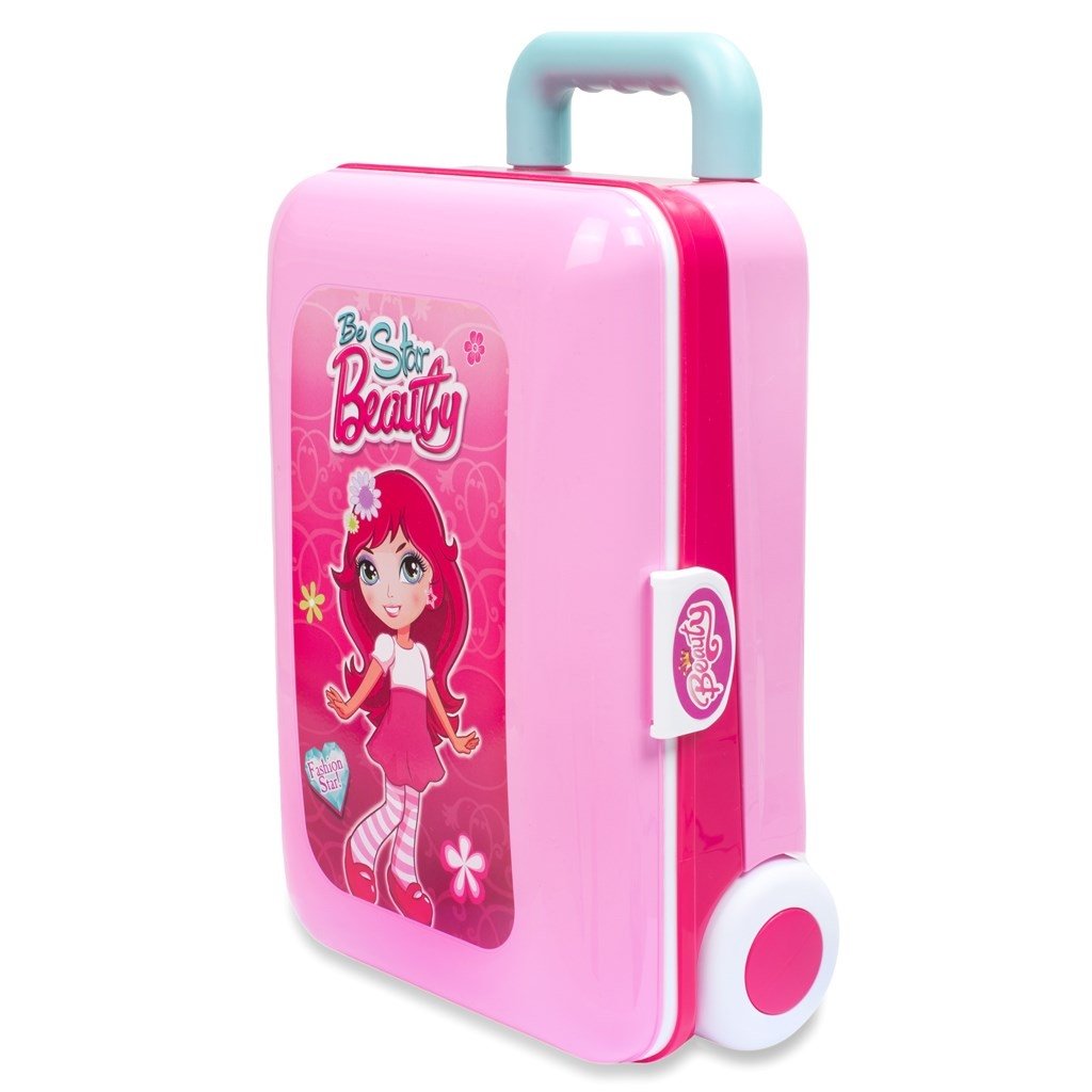 Krásný dětský toaletní stolek v kufříku Baby Mix ukrývá v sobě skutečný poklad pro každou malou princeznu. Po otevření změníte kufřík v opravdový toaletní stolek obsahující zrcadlo se světýlkem ve tvaru srdíčka, které po zmáčknutí vydává kouzelný zvuk. 3 baterie typu AAA nejsou součástí dodávky. Ve stolečku nalezne dále vaše princezna fén, dva náramky, náhrdelník, tři prstýnky, tři láhvičky s lakem na nehty, dva balzámy na rty, hřeben na vlasy a parfém. Kufřík je vybaven kolečky a teleskopickou tyčí, které každá malá princezna ocení i na cestách. Náš toaletní stoleček je skvělým dárkem pro každou malou holčičku. Sada neobsahuje skutečnou kosmetiku, celá je vyrobena z kvalitního plastu, proto je zcela bezpečná. Je určena pro děti od 3 let.Rozměry stolečku: 60 x 53 x 24,5 cm