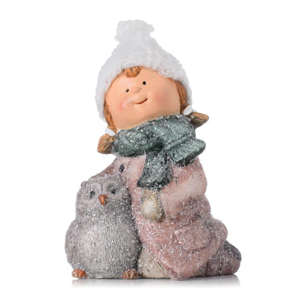 DIEVČA RUŽ. KABÁTIK SO SIV SOVIČKOU GLIT. POLY 9*7*12CM