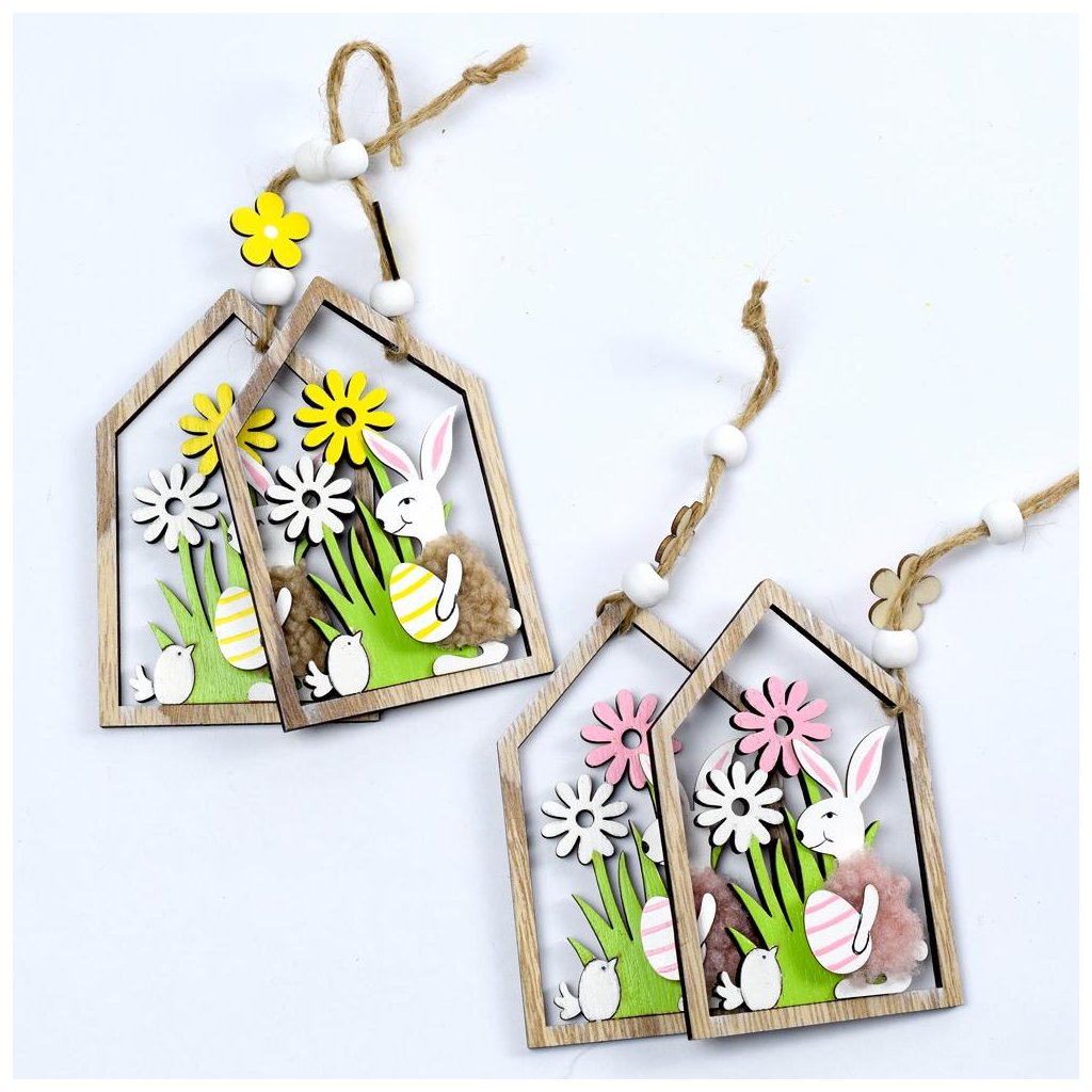 DOMEČEK ZÁVES SE ZAJÍCÍM DŘEVO S/2 MIX F 6.5x10.5CM