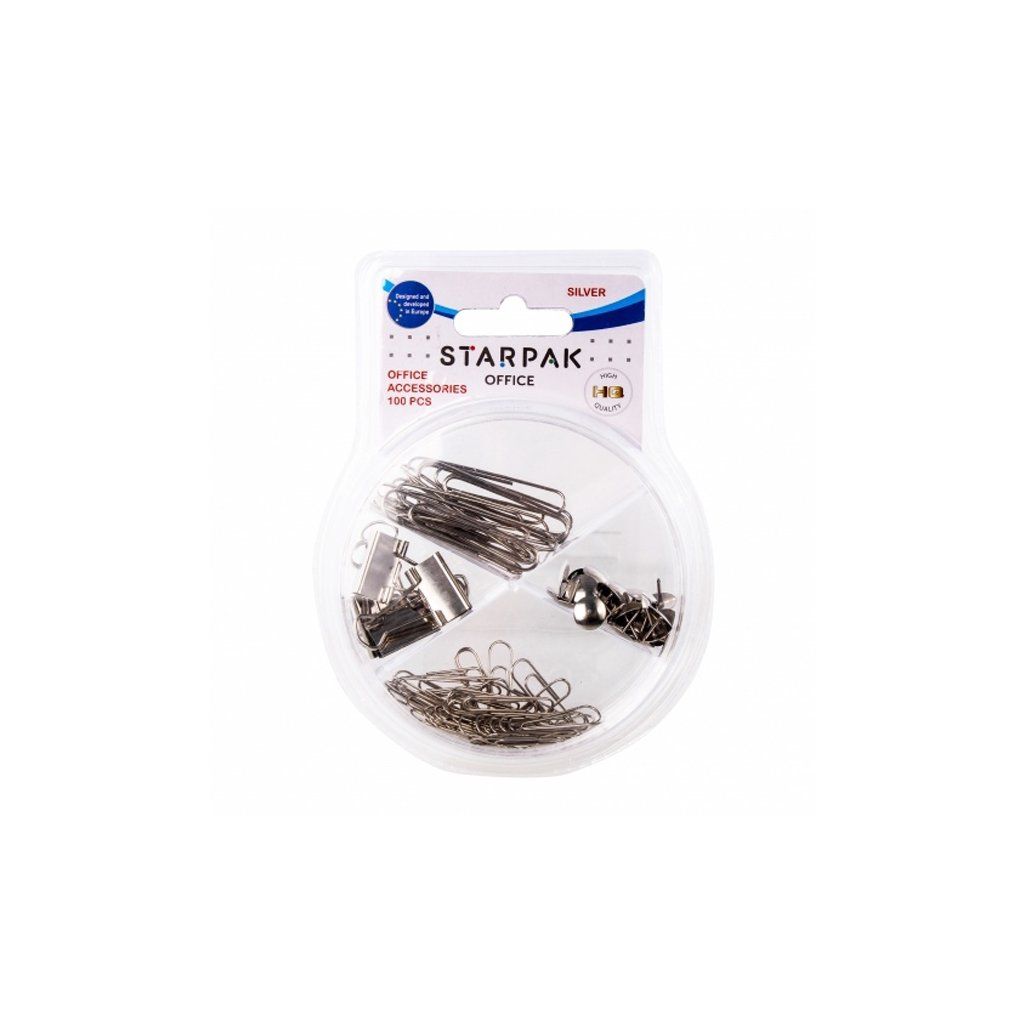Kancelářské doplňky -sada obsahuje kancelářské sponky, připínáčky a sponky v mědi nebo stříbře. Rozměry balení cm 12x16x3. Balené v průhledné krabičce.Doplňkové parametry