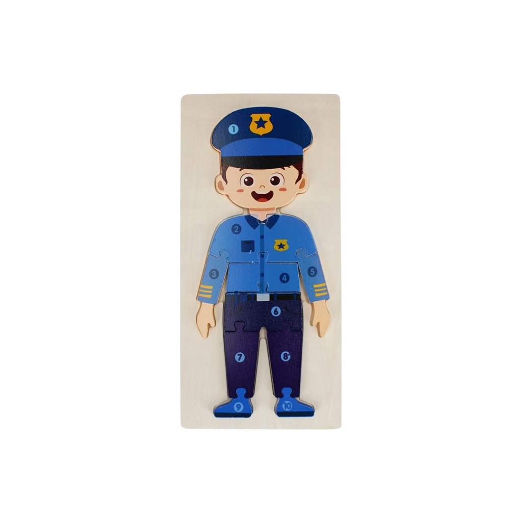 Sada obsahuje 10 dřevěných prvků ve tvaru policisty. Rozměry jsou 15x30cm.