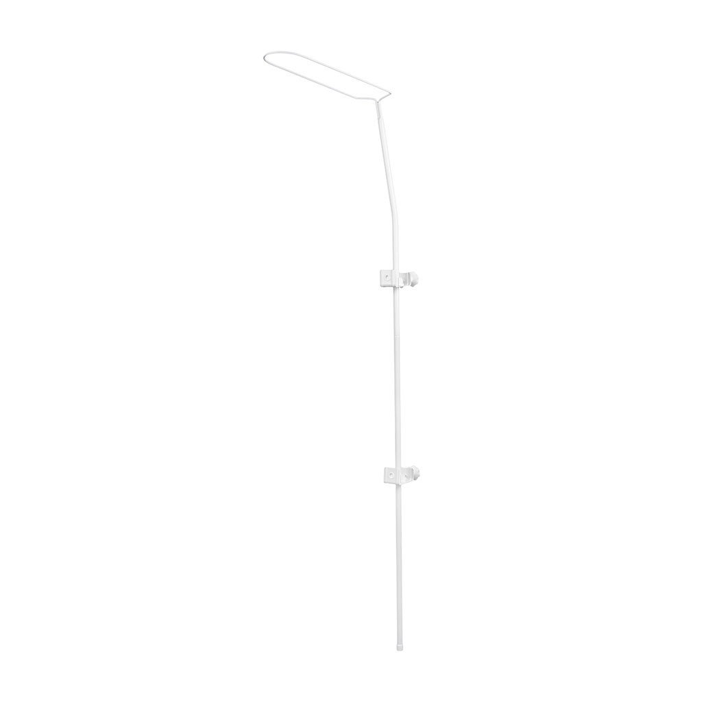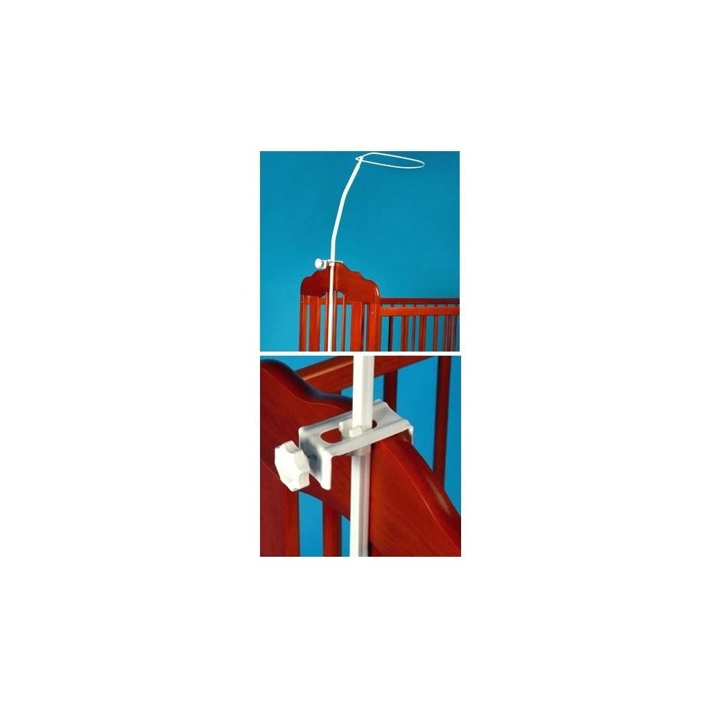 Šroubovací držák na nebesa se dvěma úchyty s dotahovacími šrouby. Úchyty je možno libovolně posouvat a přizpůsobit tak postýlce. V horní části držáku je drát pro uchycení nebes.