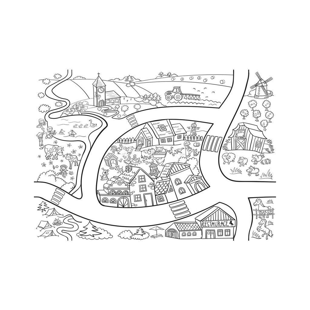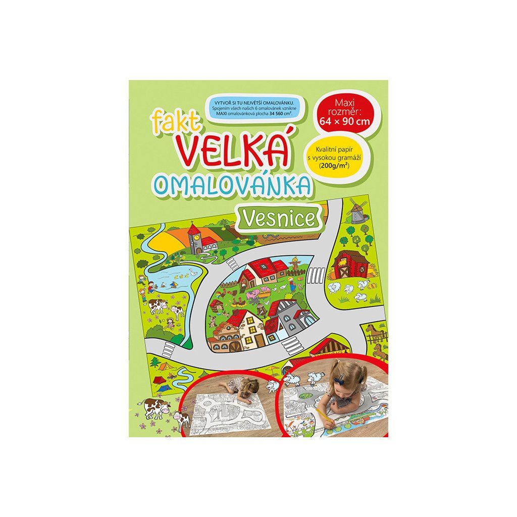 Fakt velká omalovánka Vesnice, omalovánka má rozměr 64 x 90 cm. Papír má vysokou gramáž 200 g, proto můžete zvolit pro omalování pastelky, voskovky nebo i vodové barvy. Při zakoupení všech 6 typů omalovánky je lze spojit do jednoho velkého díla propojeného cestou.Doplňkové parametry