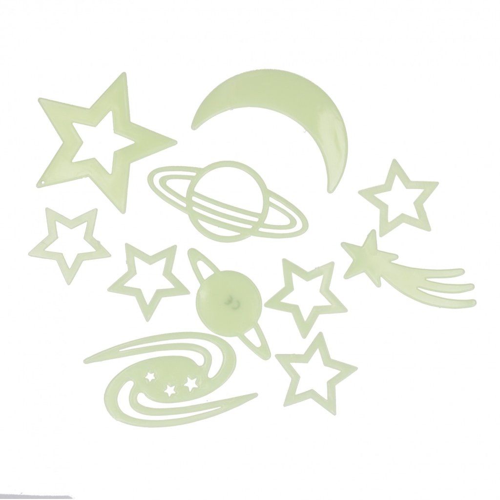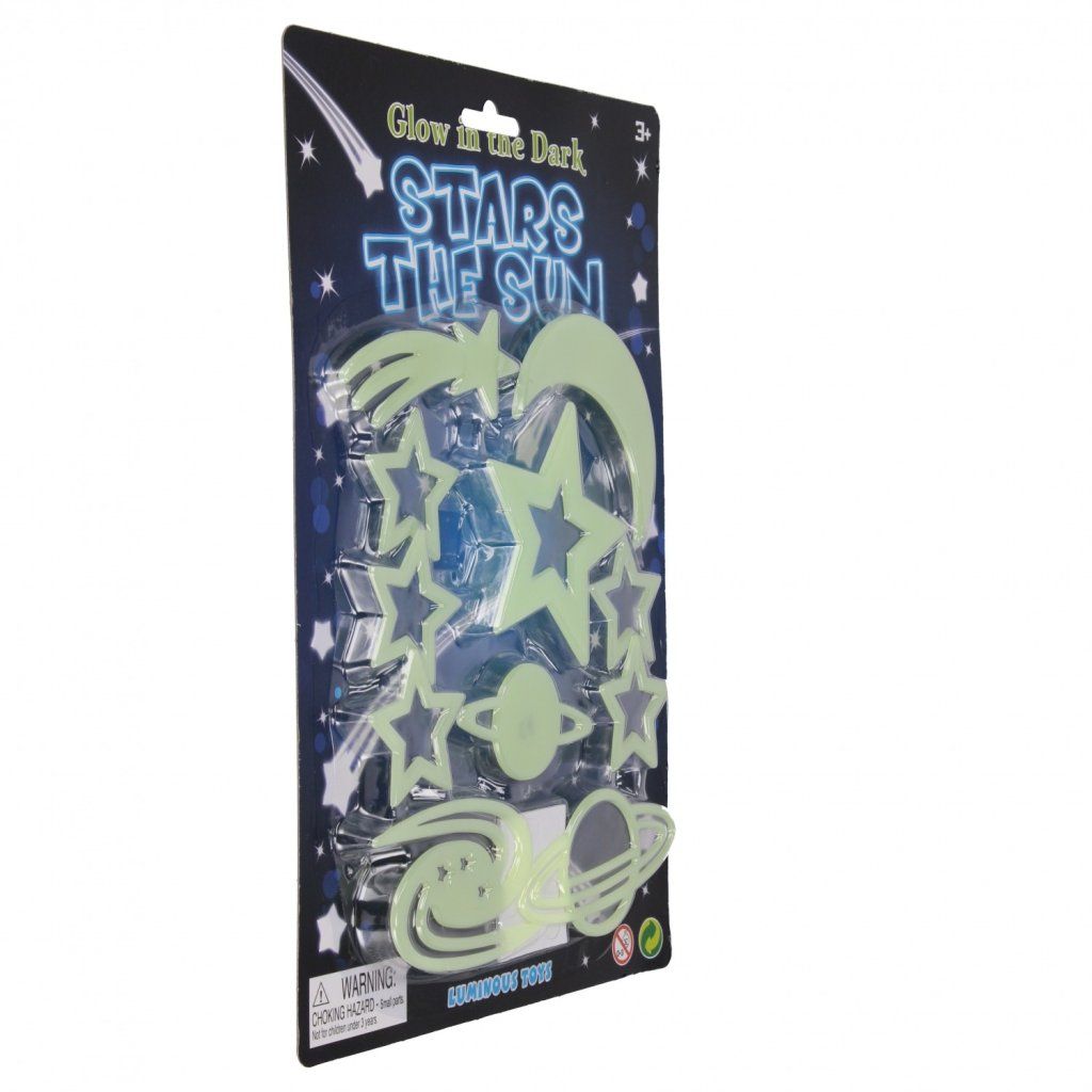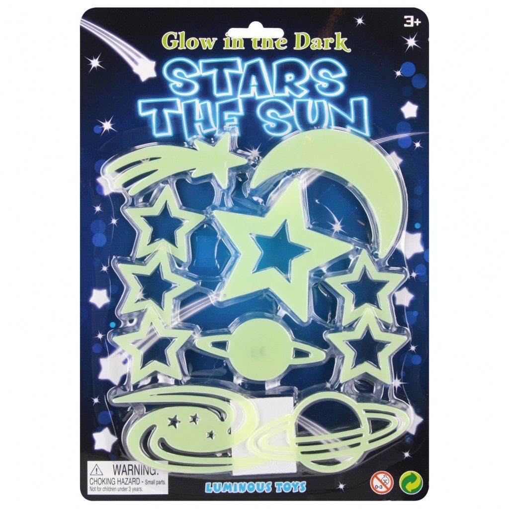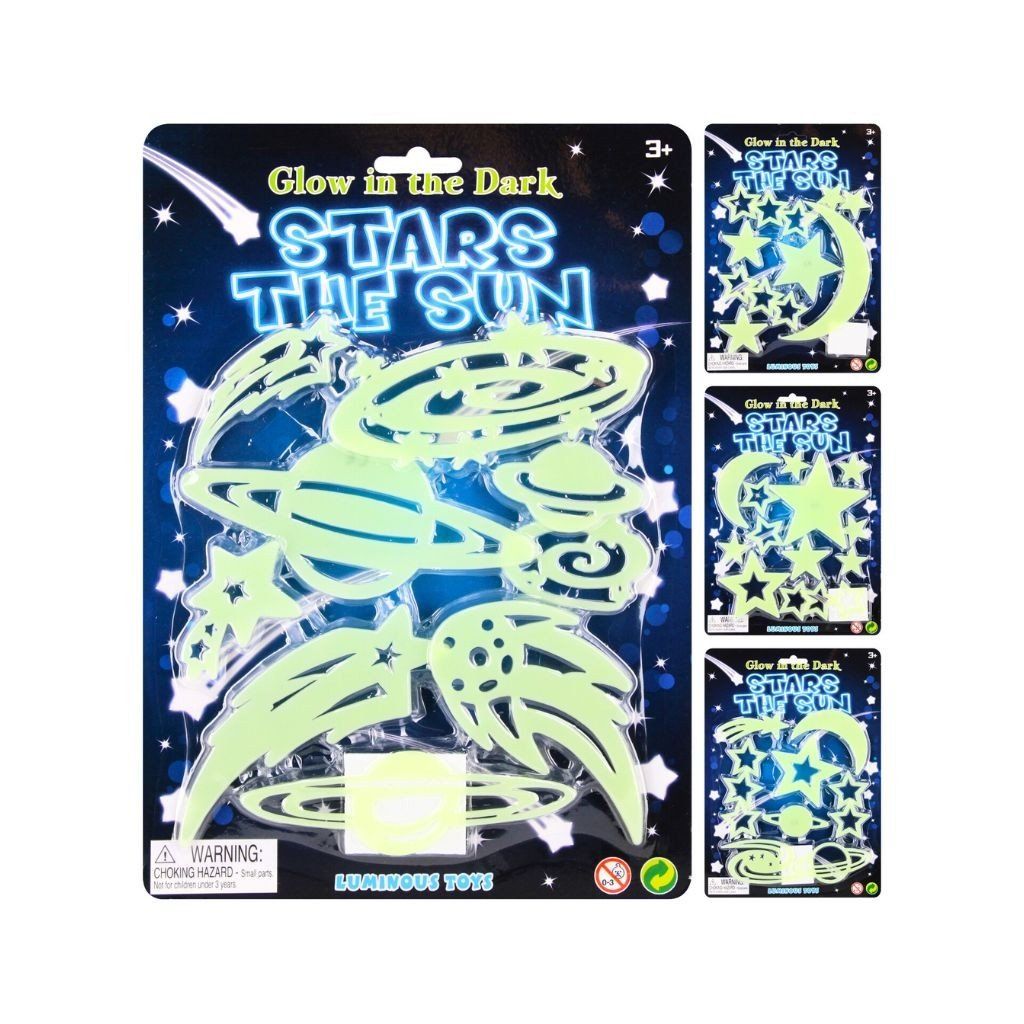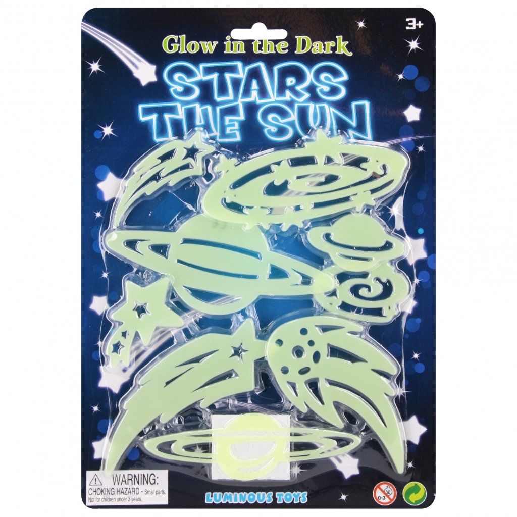 Fluorescenční vesmírné dekorace krásně svítí ve tmě a promění každý dětský pokoj v malý vesmír. Ideální na stěnu nebo strop, reagují i na UV světlo. Mix vzorů – planety, hvězdy a další tvary. Snadné nalepení. Určeno pro děti od 3 let. Cena za kus.Doplňkové parametry