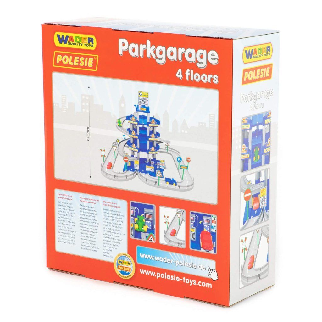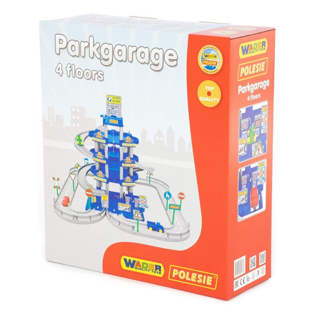 Garáž Wader 4 podlaží s auty, čerpací stanicí, mycí linkou, servisním boxem a funkčním mechanickým výtahem, součástí jsou i 3 malé autíčka. Hračka je certifikována pro děti od 3 let věku, od renomované značky Wader quality toys.Doplňkové parametry