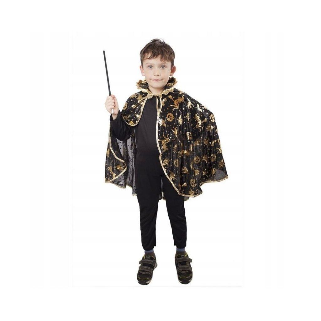 Halloweenský kouzelnický plášť v černém provedení se zlatým vzorem a výrazným límcem je ideální doplněk na karneval nebo halloweenské oslavy. Plášť o délce 73 cm umožňuje dětem proměnit se v kouzelníka a užít si zábavnou hru doma i na akcích. Vhodný pro děti od 3 do 10 let o velikosti 104-128 cm a podporuje fantazii i kreativní hraní.Doplňkové parametry
