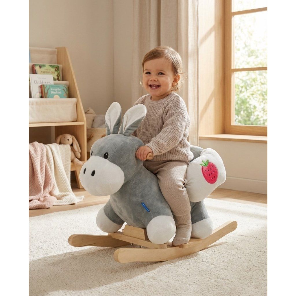 Oslík je vybaven bezpečnostními pásy, díky kterým dítě zůstává bezpečně na místě, což činí hru bezpečnou i pro nejmenší děti. Pevná konstrukce a pečlivé zpracování zajišťují dlouhodobé používání.