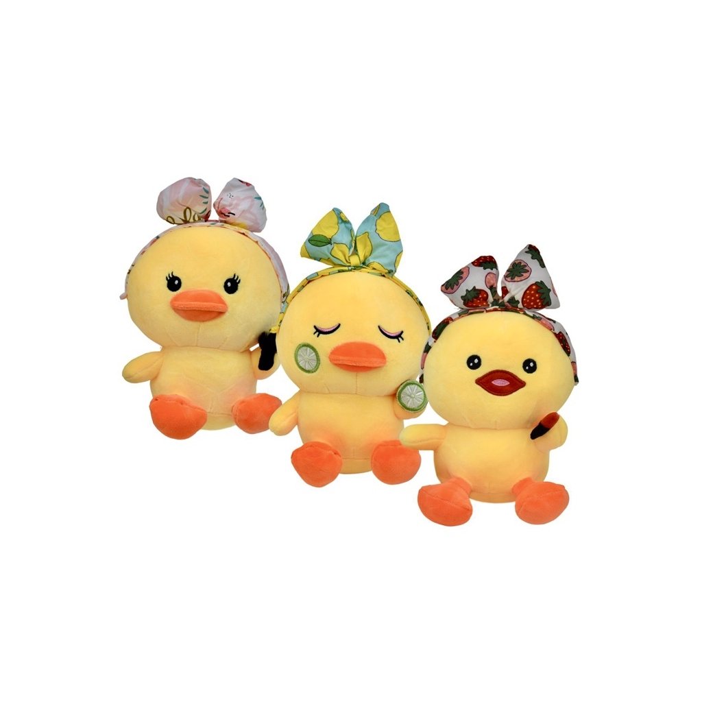 Plyšová 25cm sedící kačenka s mašličkou a vyšitými očky. Možnost výběru ze tří druhů mašličky - s jahůdkami, pelikány nebo citrony.