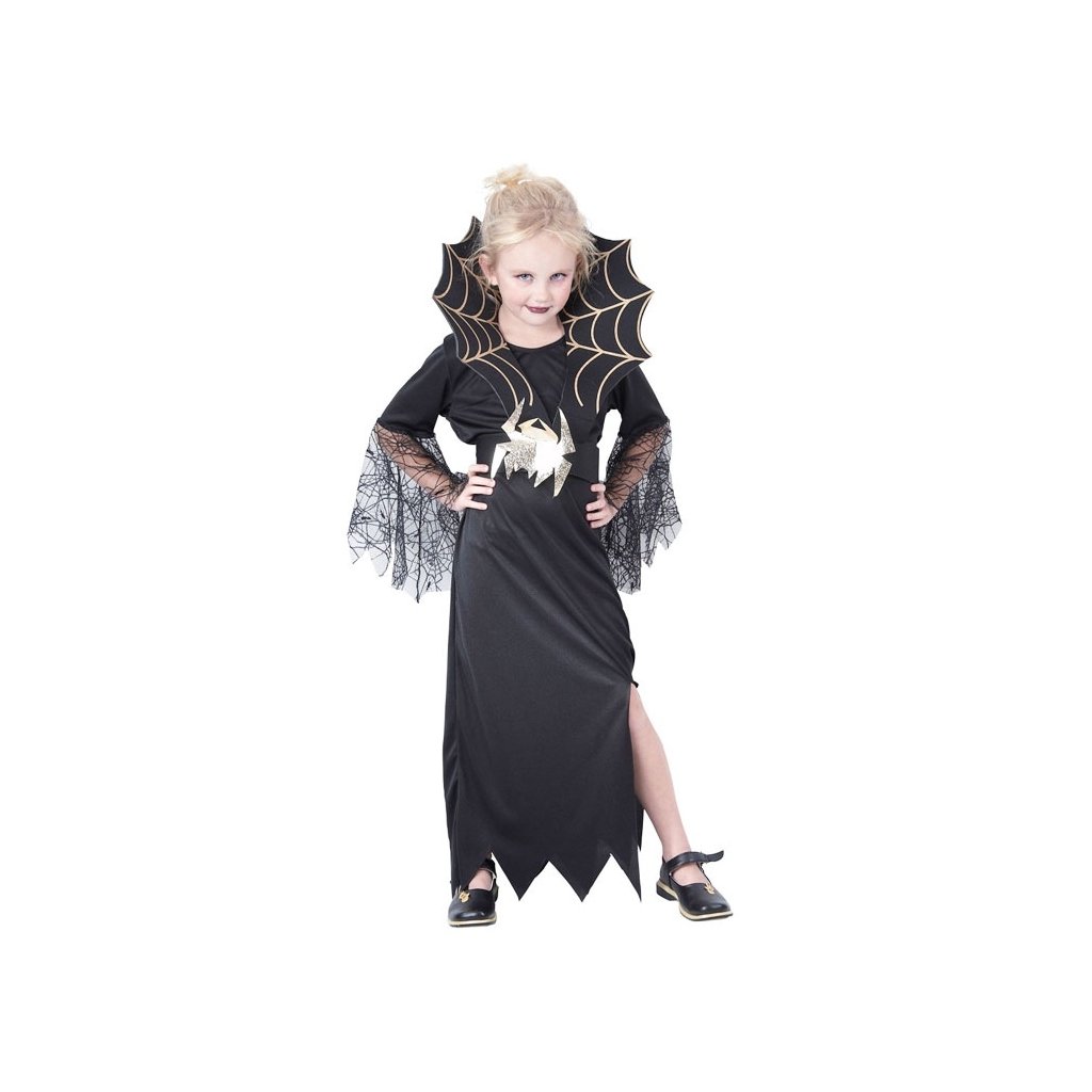 Karnevalový kostým Černá vdova C, pro děti s výškou 130 - 140 cm. V balení najdete: šaty, pásek a límec. Neobsahuje: boty.