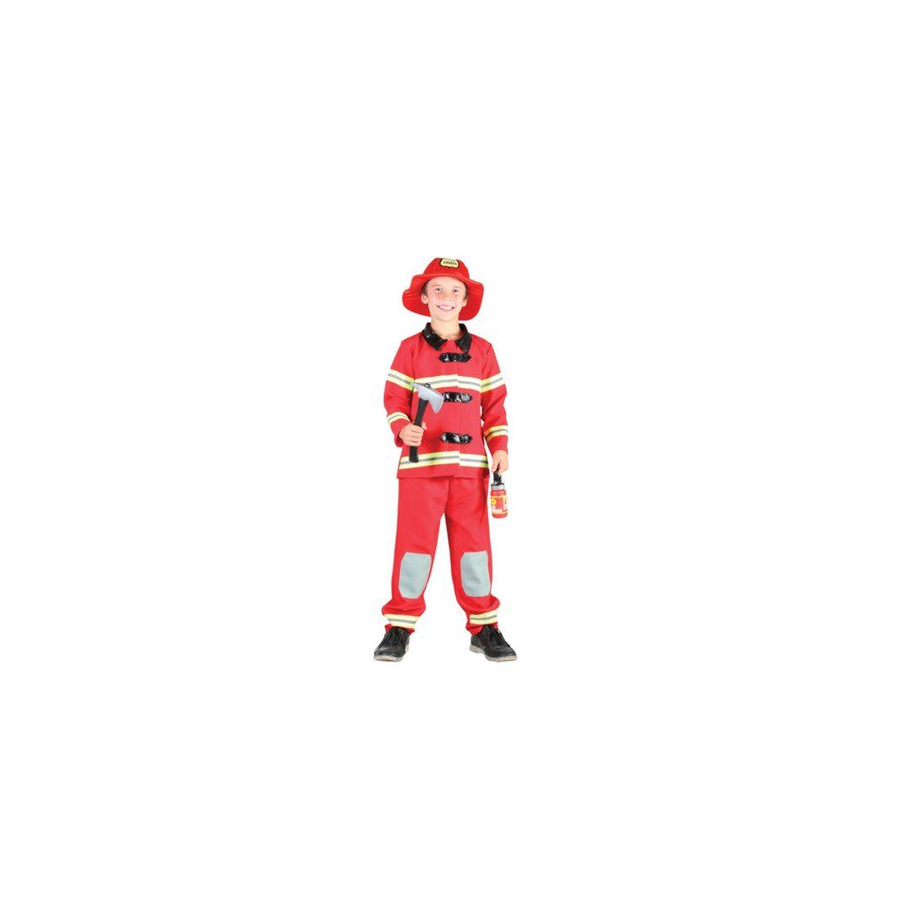 Karnevalový kostým Požárník A pro děti s výškou 110 - 120 cm. V balení naleznete: plášť, kalhoty, přikrývku hlavy. Neobsahuje: boty, sekeru a hasicí přístroj.
