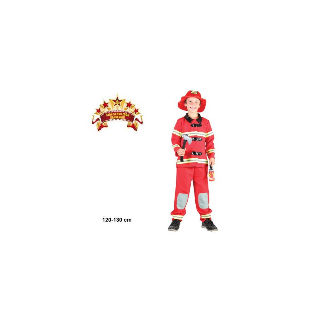 Karnevalový kostým Požárník B pro děti s výškou 120 - 130 cm. V balení naleznete: plášť, kalhoty, přikrývku hlavy. Neobsahuje: boty, sekeru a hasicí přístroj.