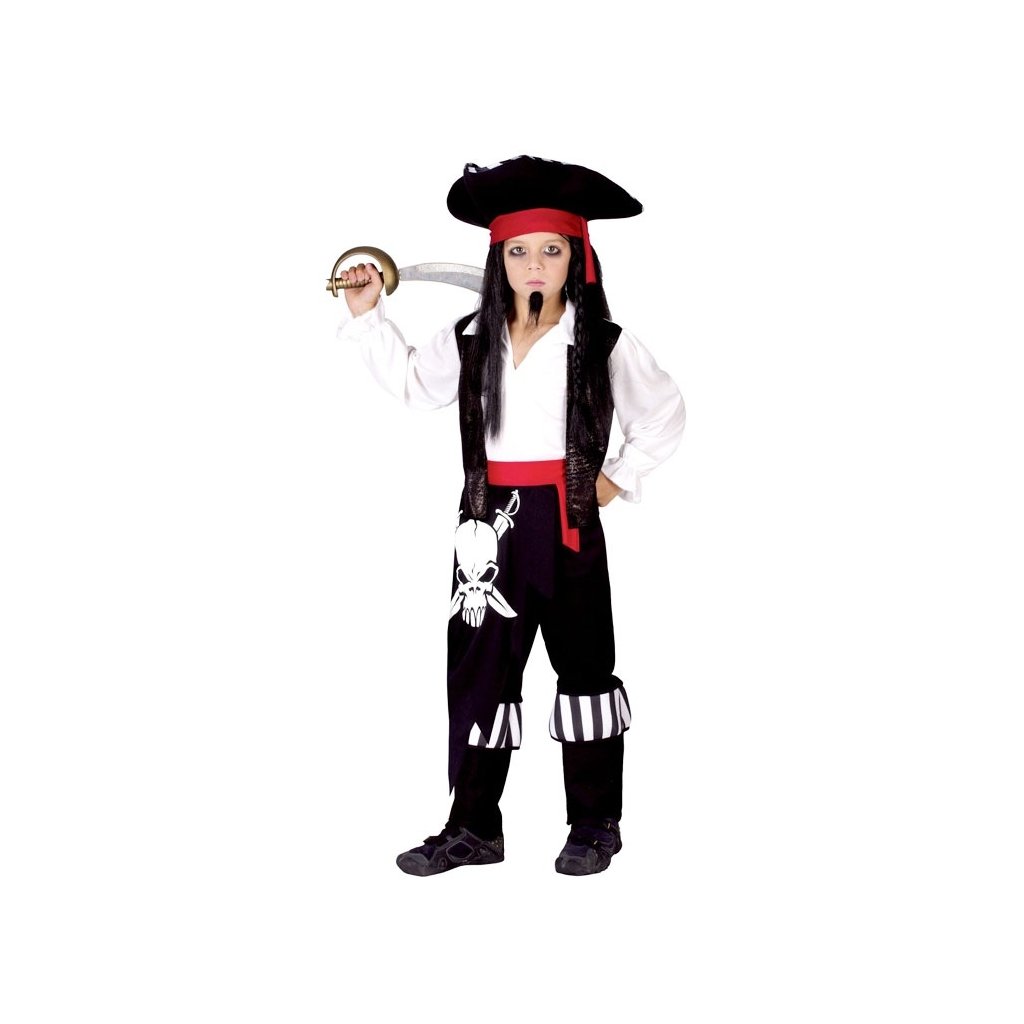Karnevalový kostým Pirát B pro děti s výškou 120 - 130 cm. V balení najdete: kalhoty s páskem, košili s vestu, návleky na boty, klobouk s čelenkou. Neobsahuje: meč, paruku, bradu, boty.