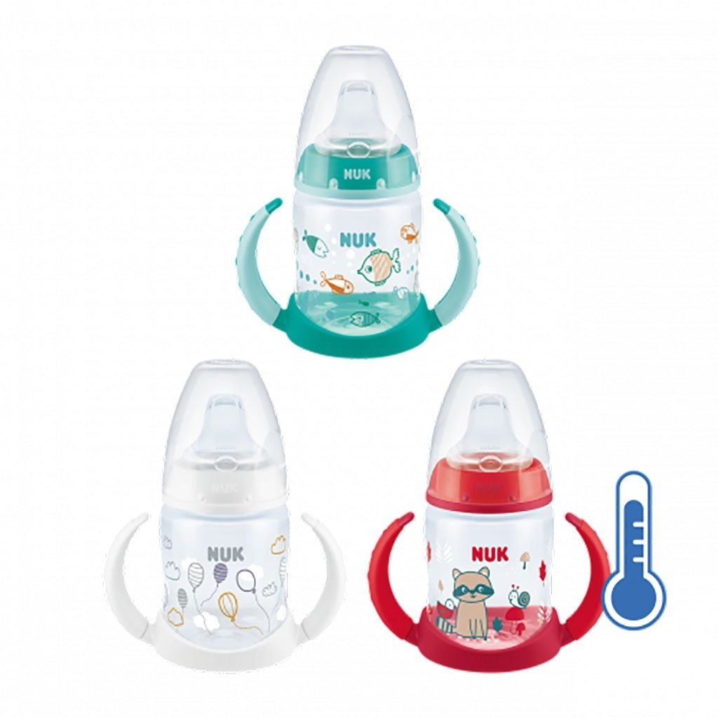 Kojenecká láhev na učení NUK First Choice s kontrolou teploty. Zabudovaný indikátor kontroly teploty změní barvu, pokud je obsah lahvičky příliš horký. Modrá barva indikátoru se změní na bílou. Lahvička miminkům usnadňuje přechod od kojení nebo krmení k samostatnému pití. Kojenecká láhev má měkké silikonové nekapající pítko a nemusíte se bát vylití obsahu. Je ergonomicky tvarovaná a má protiskluzová držátka, takže si dítě může láhev držet samo například i při jízdě v kočárku. Výhodou této super lahvičky je, že se snadno rozmontujete a čistí. Vyrobená z vysoko kvalitného plastu polypropylénu a neobsahuje BPA (Bisfenol A). Vhodné pro děti od 6 do 18 měsíců. Klinicky testováno. Balení obsahuje:- lahvička s pítkem 150 ml
