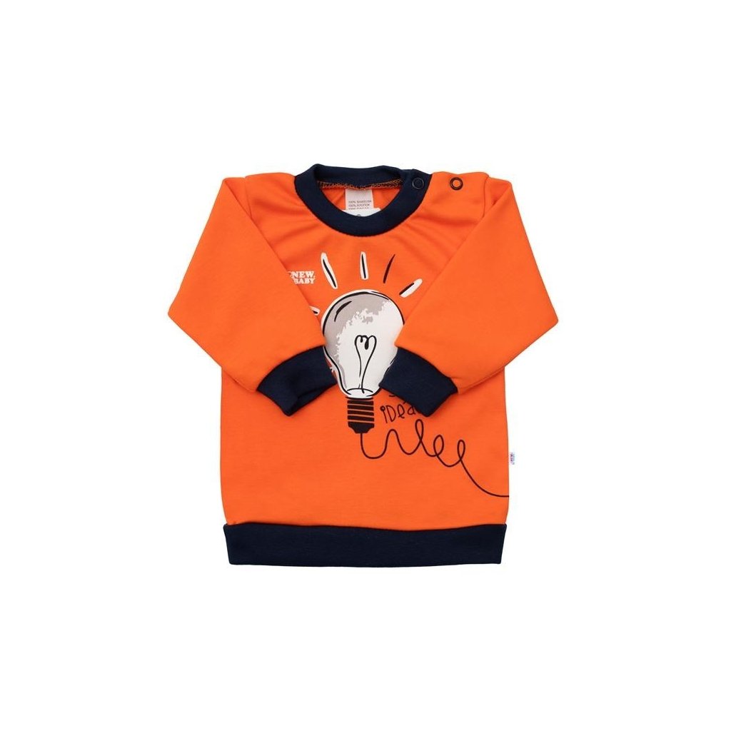 Bavlněné kojenecké tričko české značky New Baby Happy Bulbs. Tričko s dlouhým rukávem a barevným lemem okolo krčku, rukávů a v pase je celopotištěné vtipnými a šťastnými žárovkami s nápisem good idea. Zapínání na ramínku na cvoček usnadní oblékání. Tričko je vyrobené s ohledem na potřeby malých dětí s velmi příjemného materiálu. Složení: 100% bavlna.Doplňkové parametry