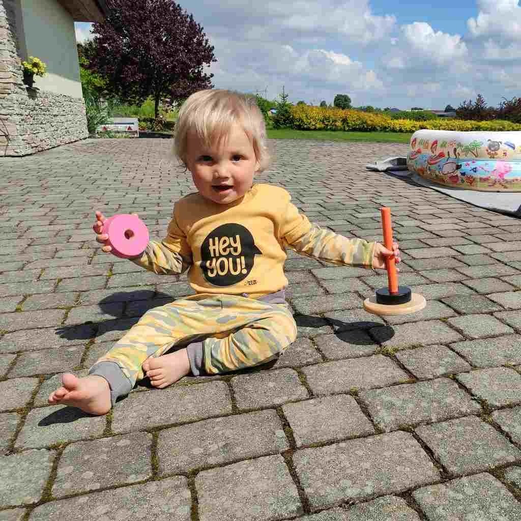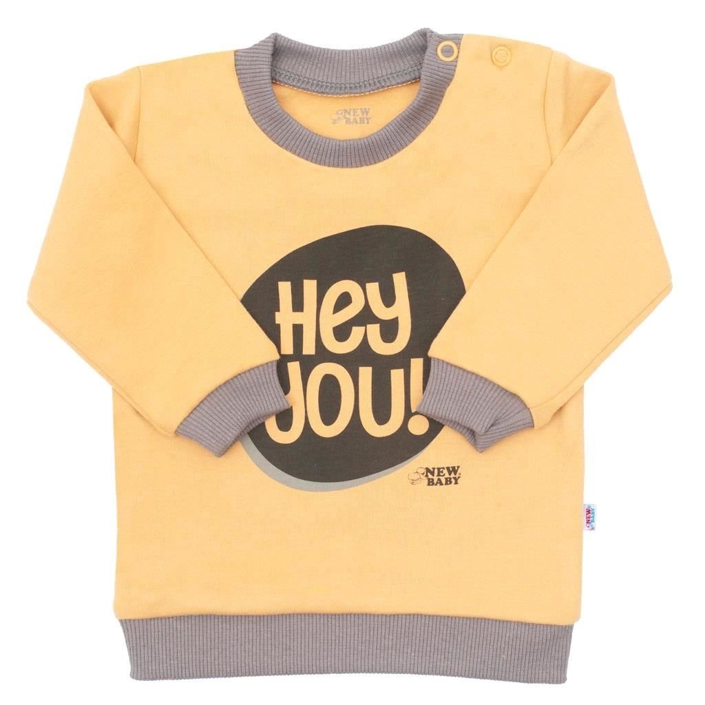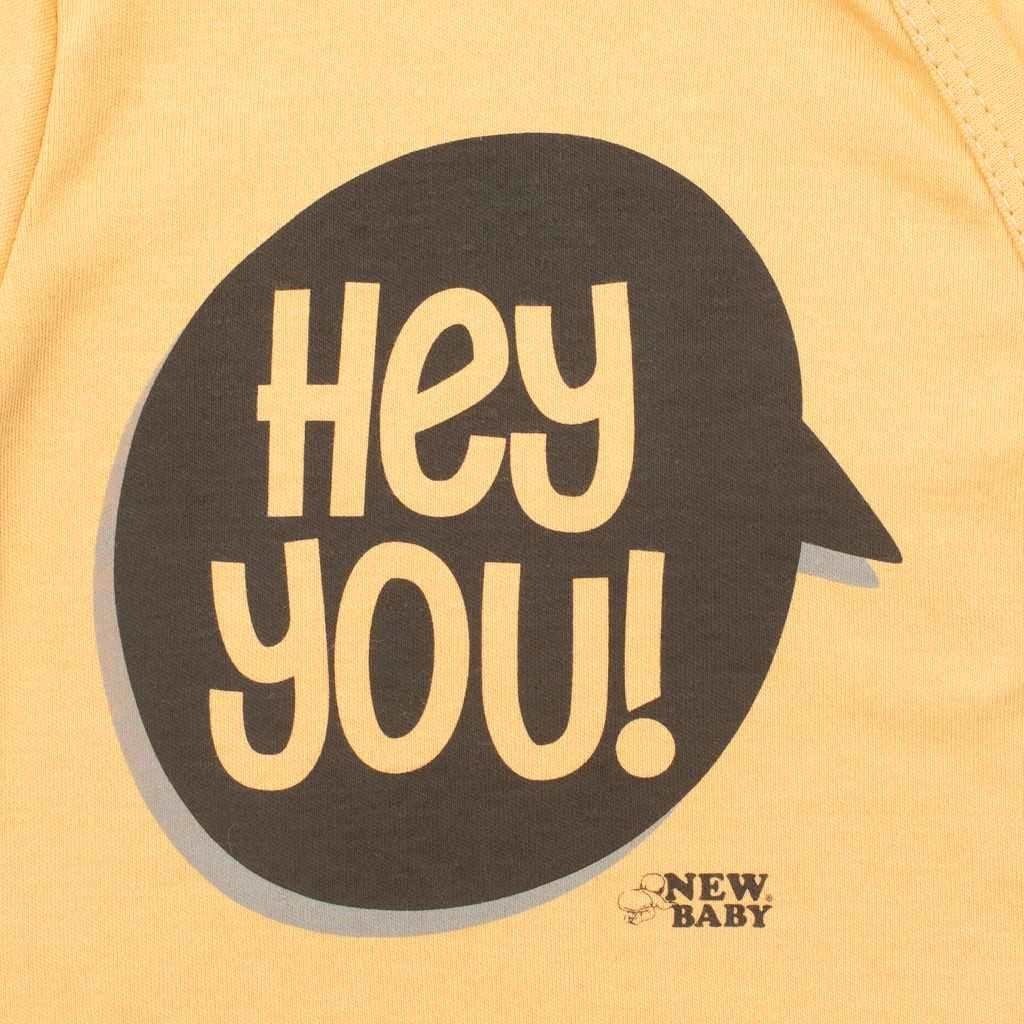 Bavlněné kojenecké tričko české značky New Baby With Love. Tričko s dlouhým rukávem a šedým lemem okolo krčku a rukávů je zdobeno nápisem Hey You!. Zapínání na ramínku na cvočky. Složení 100% bavlna.