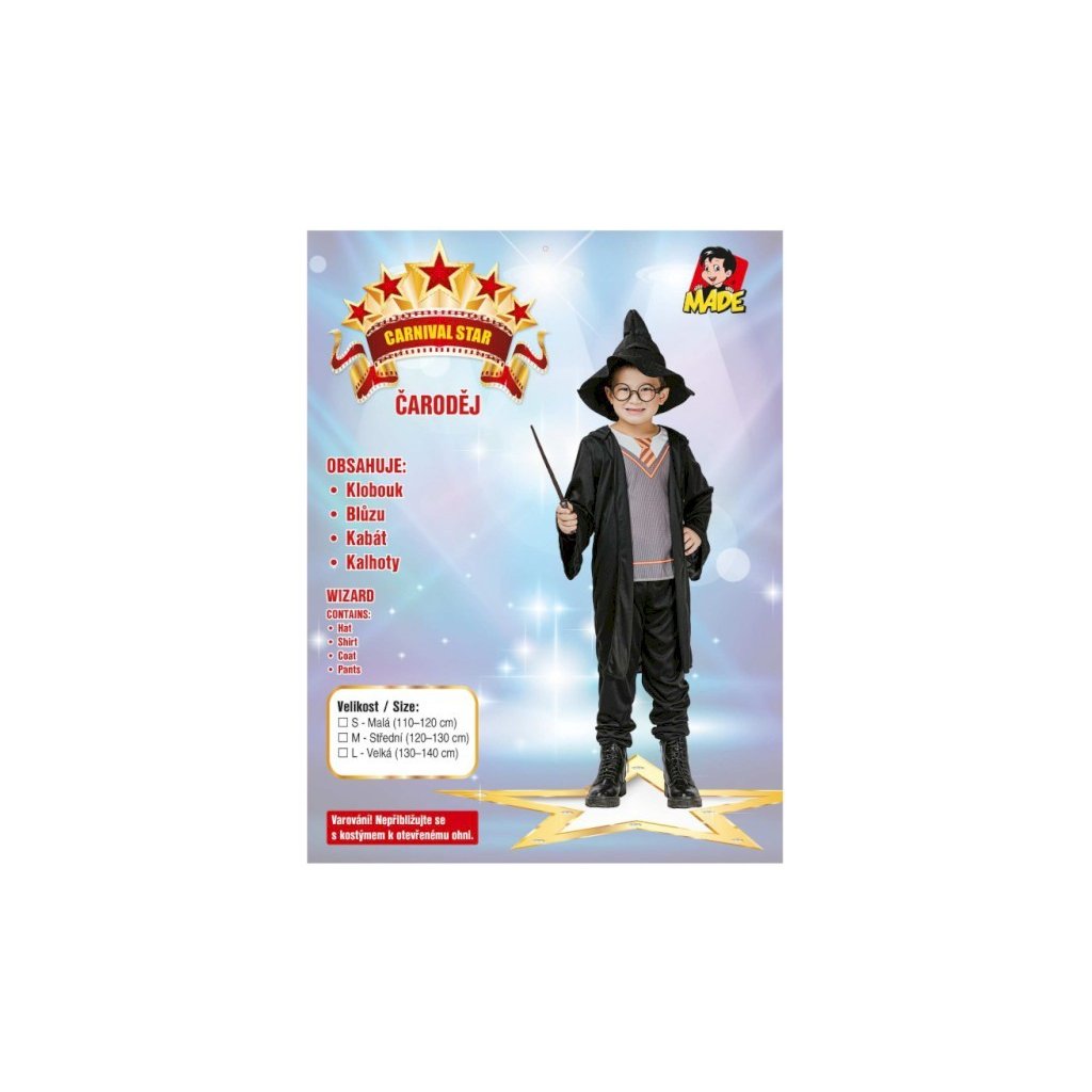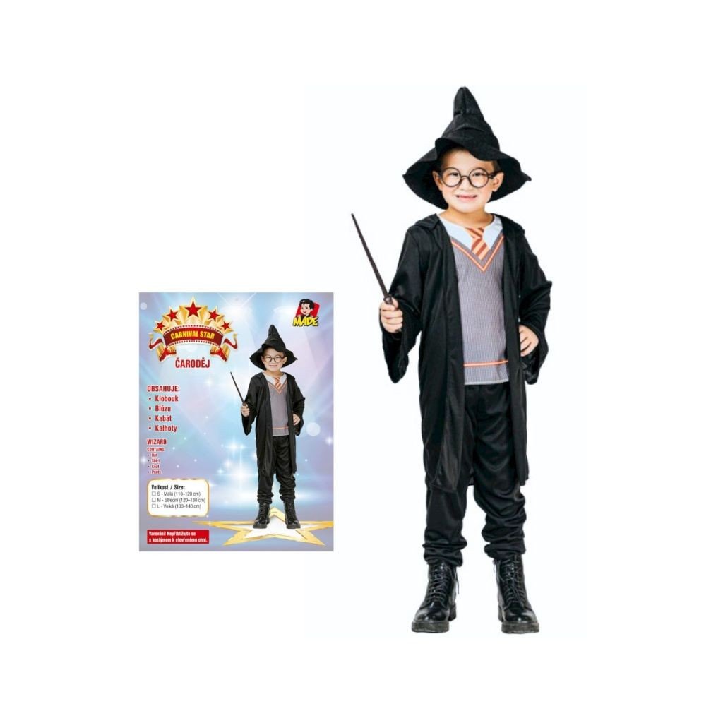 Karnevalový kostým kouzelníka pro děti, vhodný na karnevaly, dětské párty a školní vystoupení. Kostým obsahuje klobouk, blůzu, kabát a kalhoty a umožňuje dětem vžít se do role čaroděje. Vhodné pro děti o výšce 120–130 cm.Doplňkové parametry