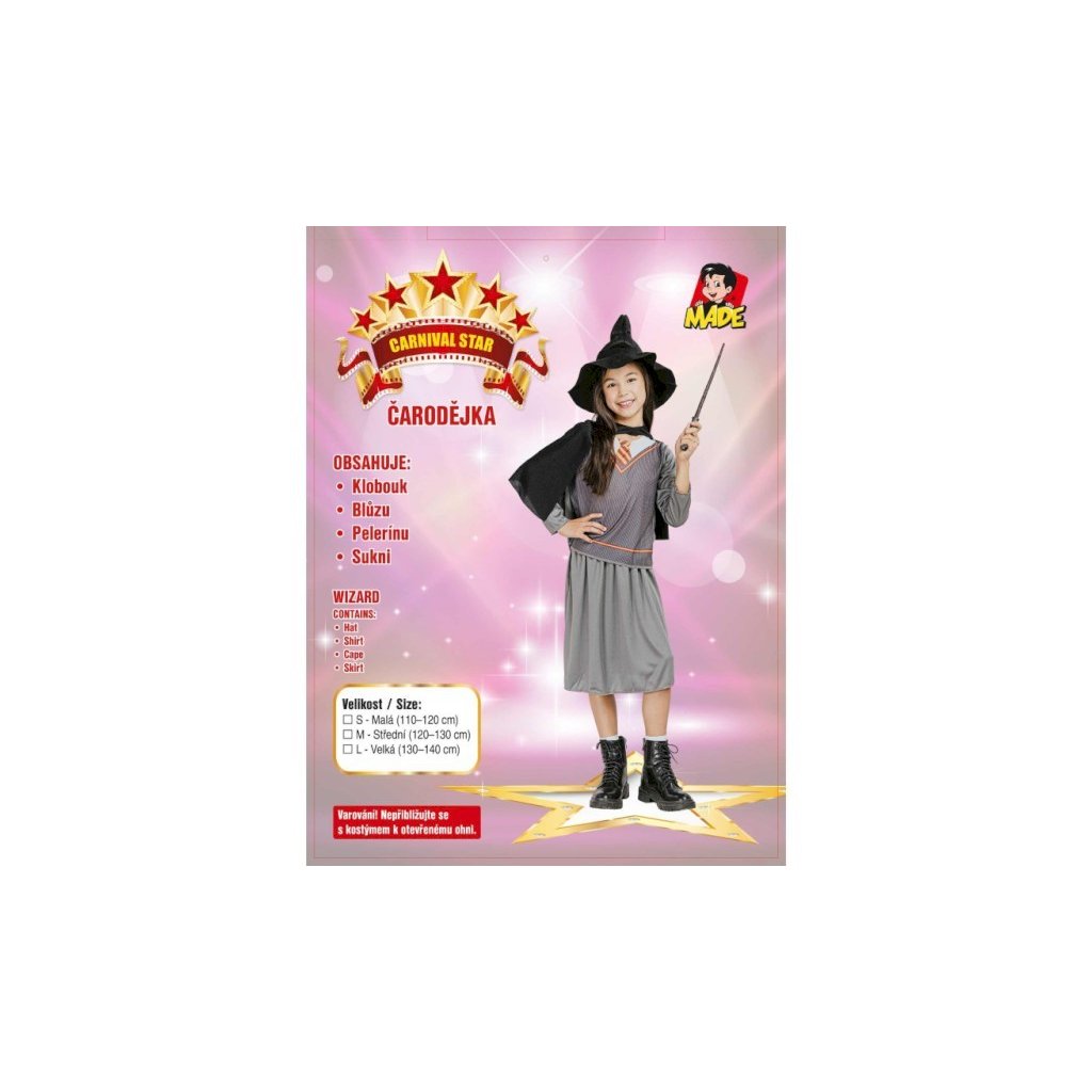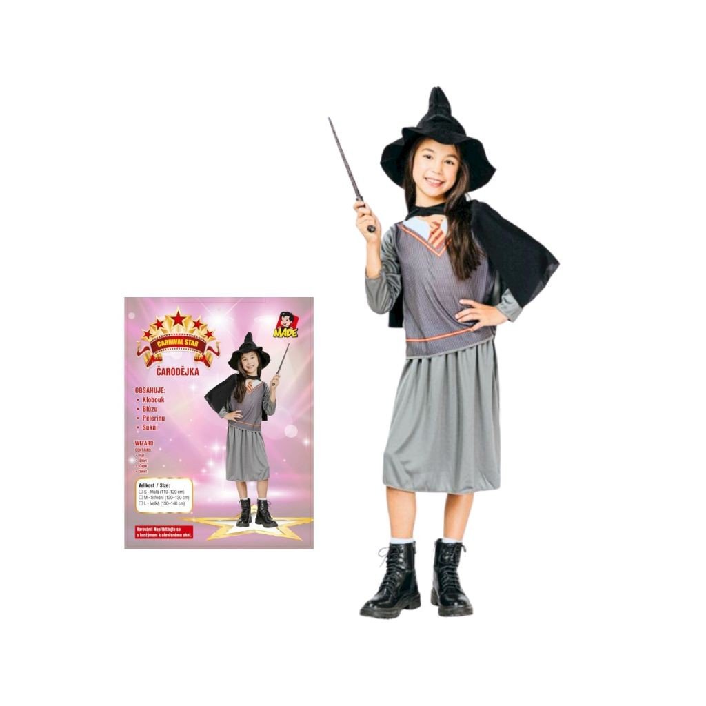 Karnevalový kostým čarodějnice pro děti, vhodný na karnevaly a školní akce. Součástí balení je klobouk, blůza, pelerína a sukně. Určeno pro děti o výšce 120–130 cm.