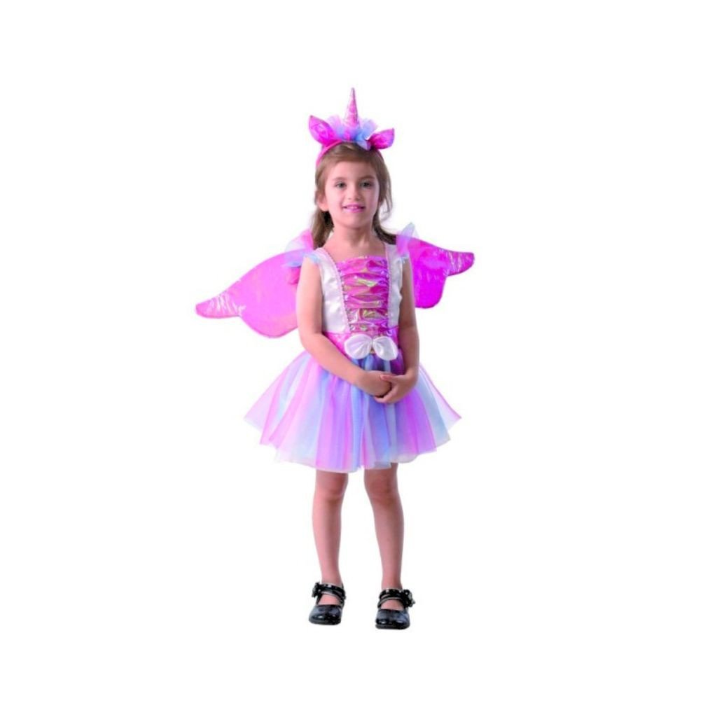 Karnevalový kostým jednorožce pro malé děti s pohádkovým motivem. Balení obsahuje šaty, křídla a ozdobu hlavy s rohem. Určeno pro děti o výšce 80–92 cm.