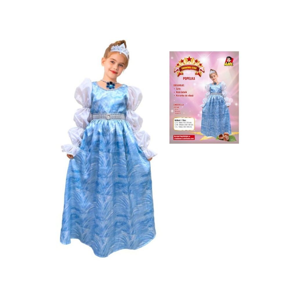 Karnevalový kostým Popelky pro děti, ideální na karnevaly a školní vystoupení. Balení obsahuje šaty, náhrdelník a korunku do vlasů. Určeno pro děti o výšce 120–130 cm.