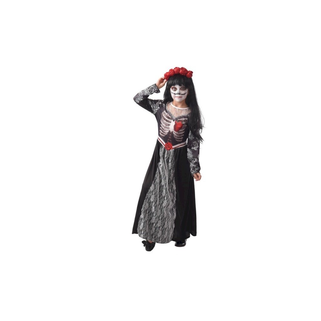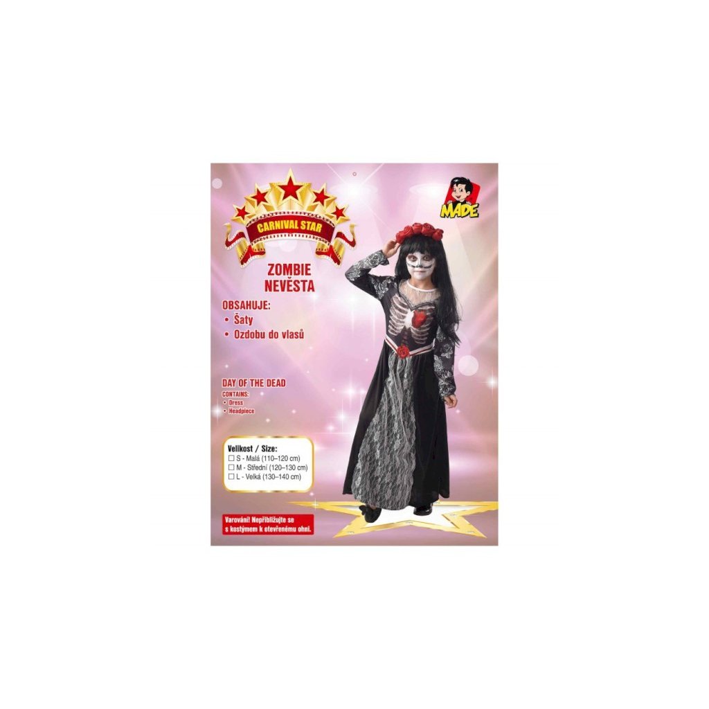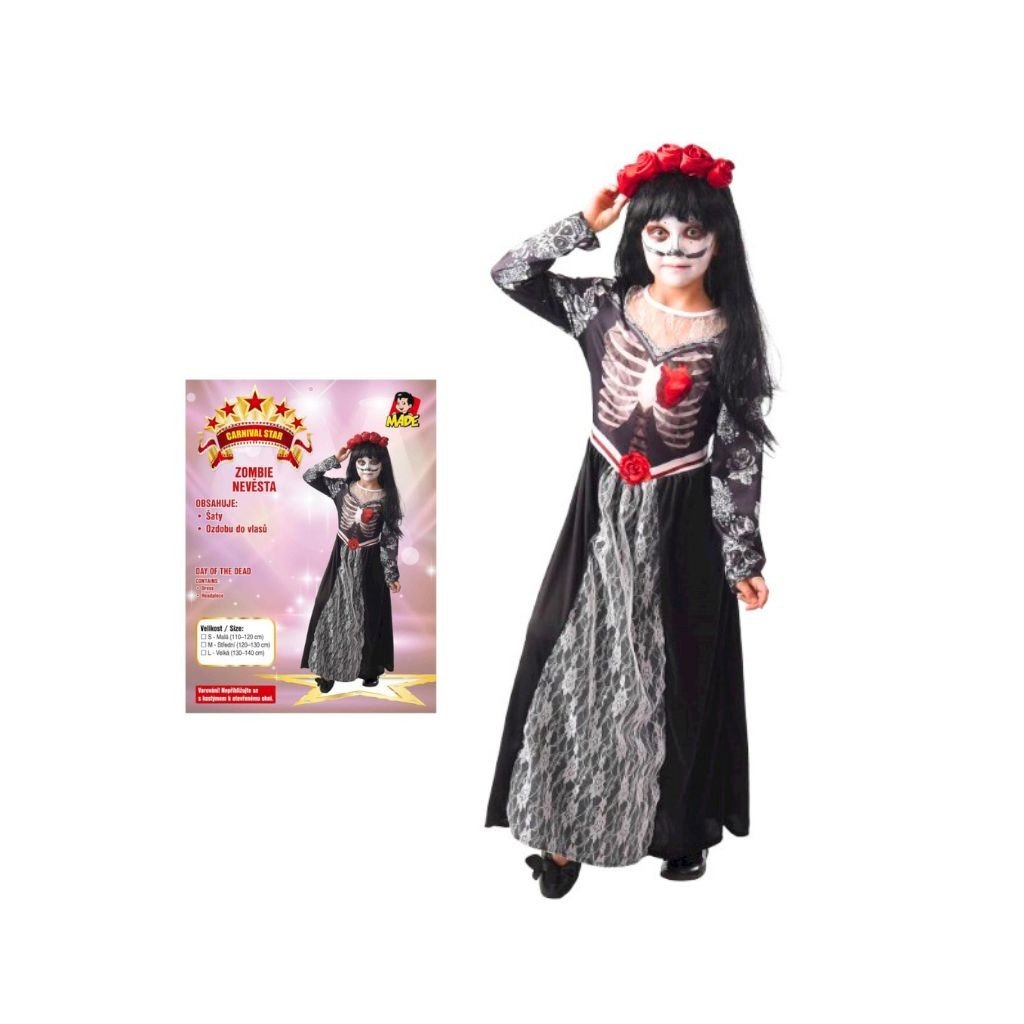 Karnevalový kostým zombie nevěsty pro dívky, vhodný pro karnevaly a tématické párty. Součástí balení jsou šaty a ozdoba do vlasů. Určeno pro děti o výšce 120–130 cm.