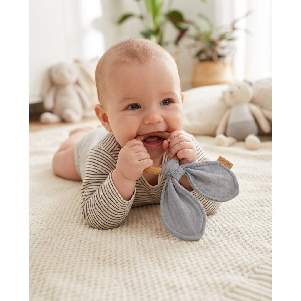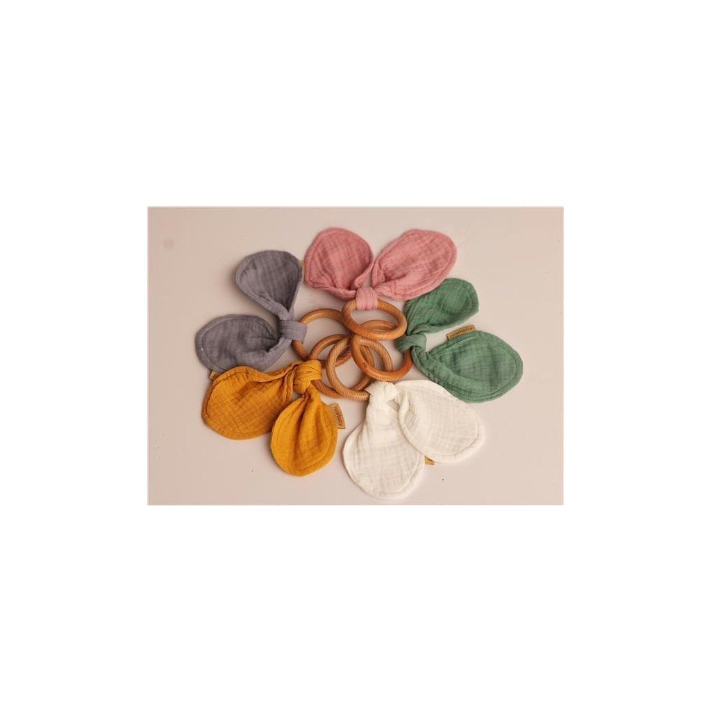Kousátko s mušelínovou plenou je ideální sada, když se dítěti prořezávají zoubky. Kousátko je vyrobeno z bukového dřeva šetrného ke středu a měkké mušelínové látky. Zcela bezpečné pro děti přináší uklidňující úlevu při prořezávání zoubků. Kousátko lze použít také jako hračku pro miminka. Kousátko se dokonale hodí k našim dalším mušelínovým výrobkům a vytváří tak krásnou sadu, kterou lze darovat na dětskou oslavu.