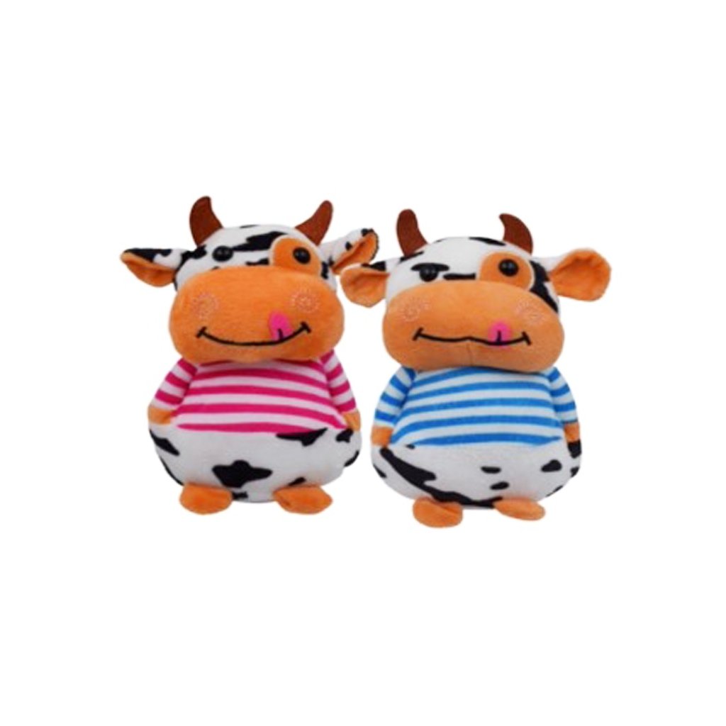 Veselá plyšová stojící 20 cm kravička v kalhotách. Možnost výběru ze dvou barev trička - růžová nebo modrá.