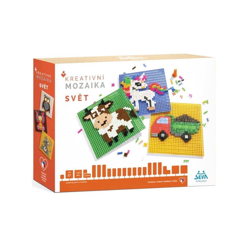 Stavebnice mozaikového typu SEVA Mozaika - Svět je nejen skvělá hračka, ale také pomůcka na cvičení jemné motoriky vašich dětí. Kromě motoriky si děti budou zlepšovat představivost a tvořivost. Základem stavebnice je plastová mřížka, do které se vmačkávají dílky podle fantazie nebo předlohy. Plastové mřížky lze navíc spojovat, takže si můžete vytvořit neomezeně velké plátno pro vaši mozaiku! Všechny stavebnice Mosaic Color jsou vzájemně plně kompatibilní, takže ji můžete neustále rozšiřovat a doplňovat o nové dílky.Doplňkové parametry