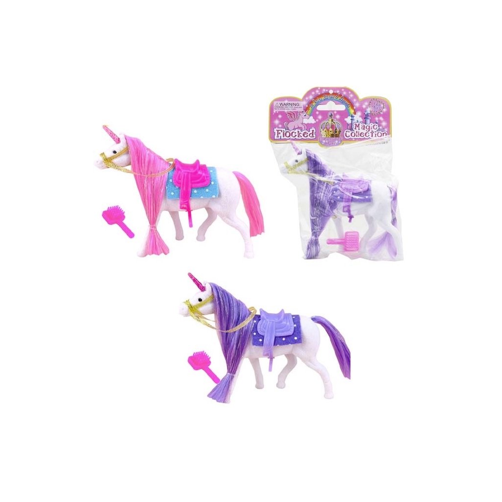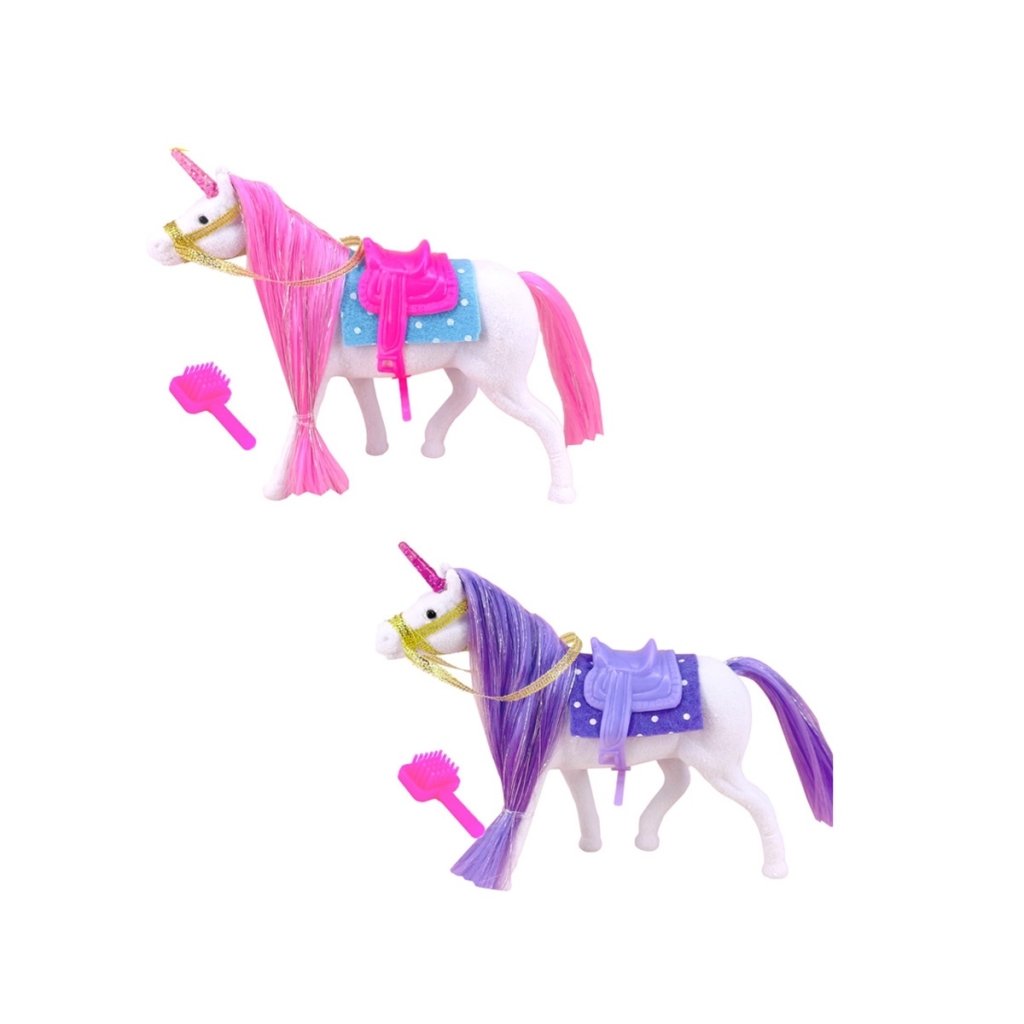 Kůň jednorožec se štětcem, uzdou, sedlem a sedlovou podložkou. Hračka je určena pro děti 3+. Rozměr hračky je 14 x 15 x 4 cm. Produkt je určený pro holky. Na výběr z 2 barev. cena za kus.Doplňkové parametry