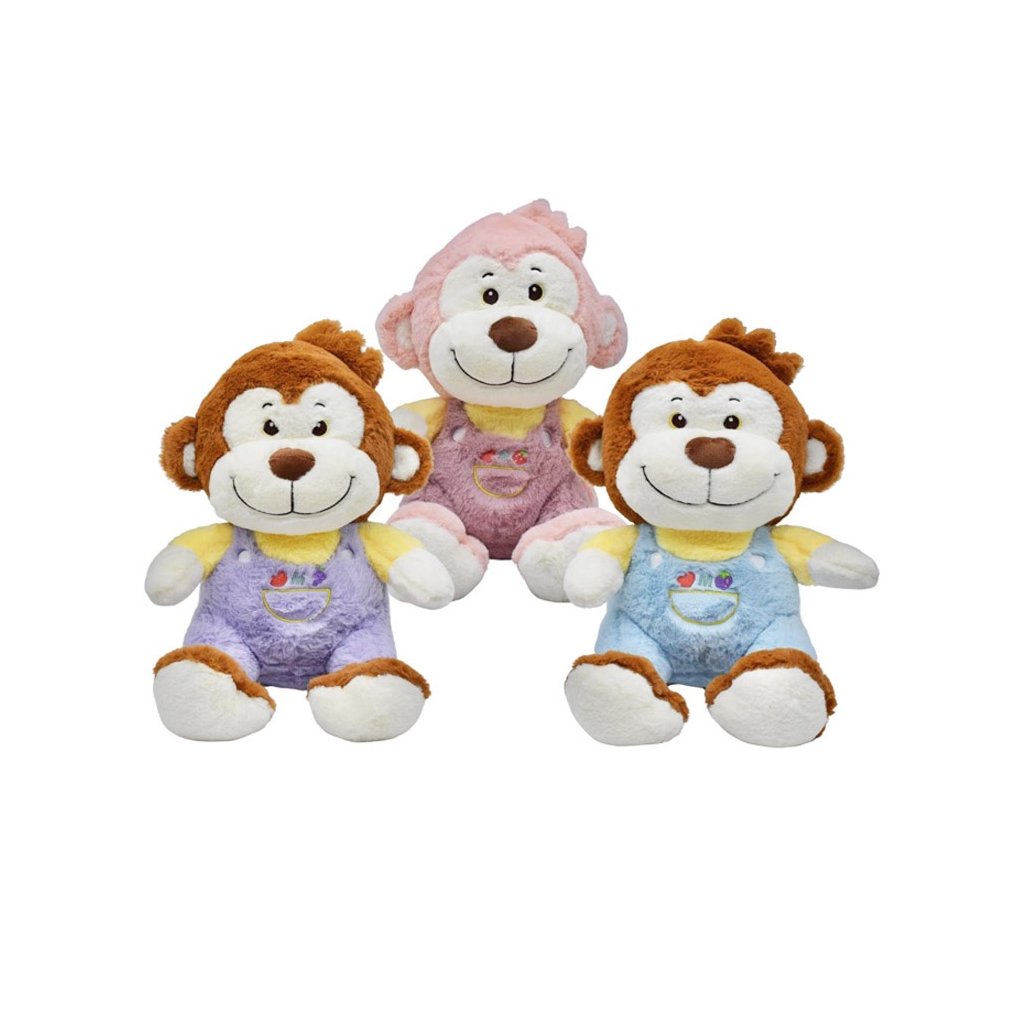 Plyšová 40cm usměvavá opice Megan. Možnost výběru ze tří barev kalhot – modré, růžové nebo fialové. Příjemné na dotek. Cena za kus.