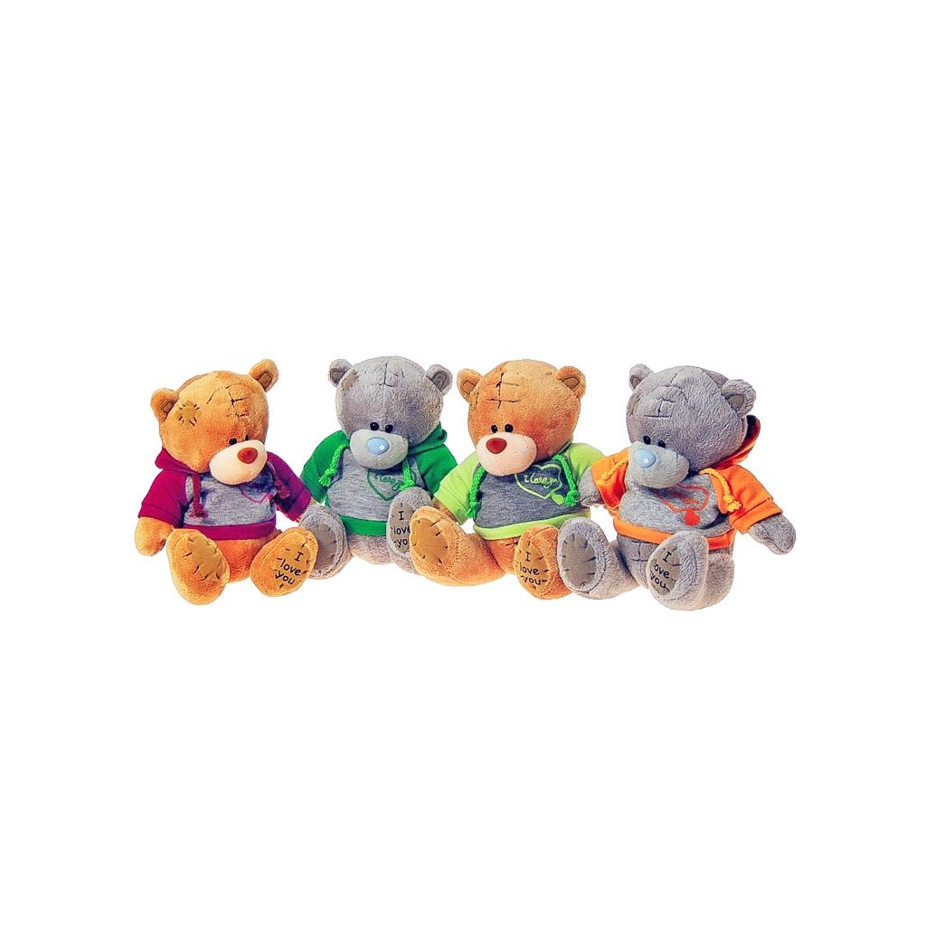 Plyšový 20cm sedící medvídek se záplatami a barevnou mikinou. Možnost výběru z různých barev. Příjemný na dotek.
