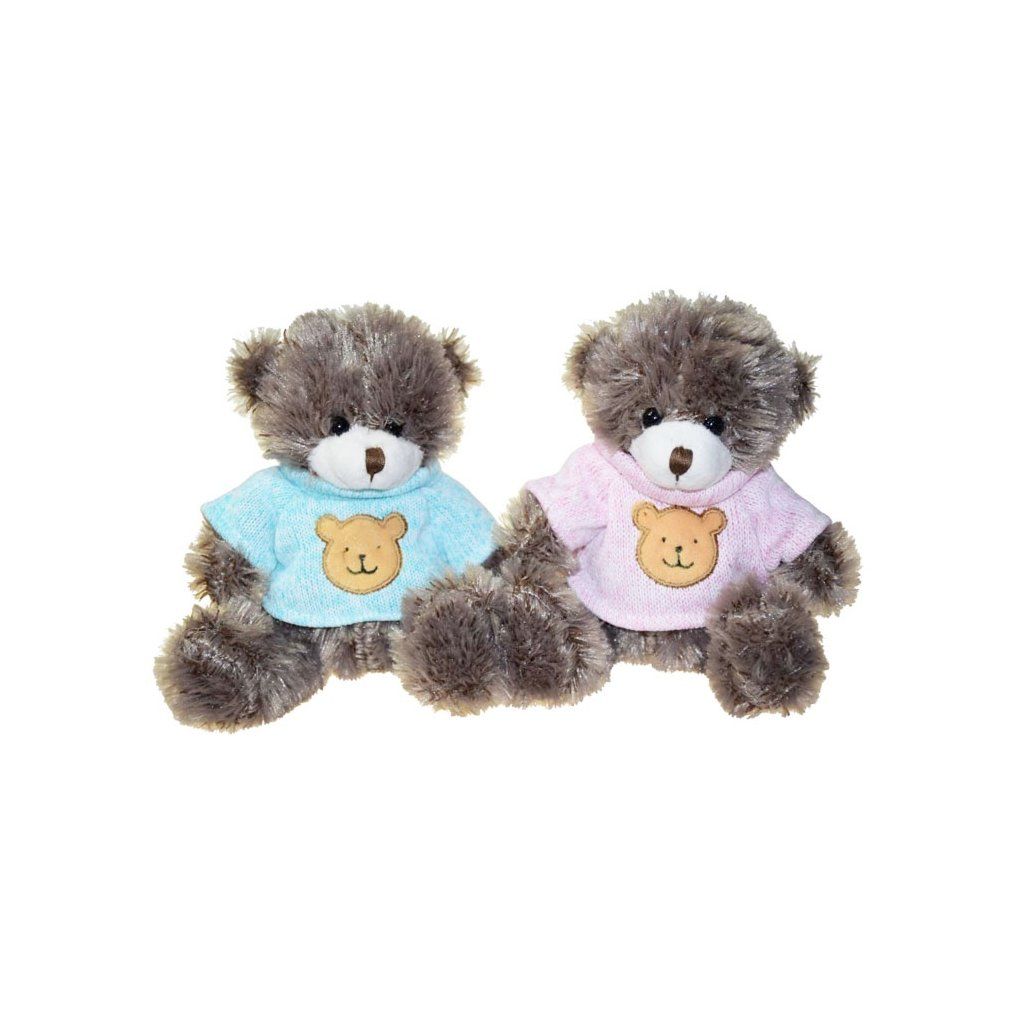 Plyšový 15cm sedící medvídek v tričku. Možnost výběru ze dvou barev trička - modré nebo růžové.