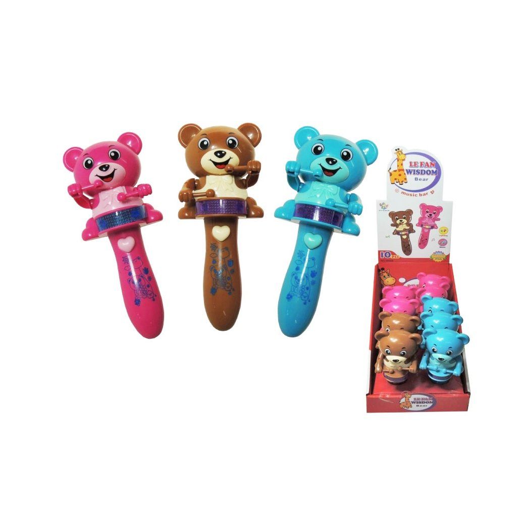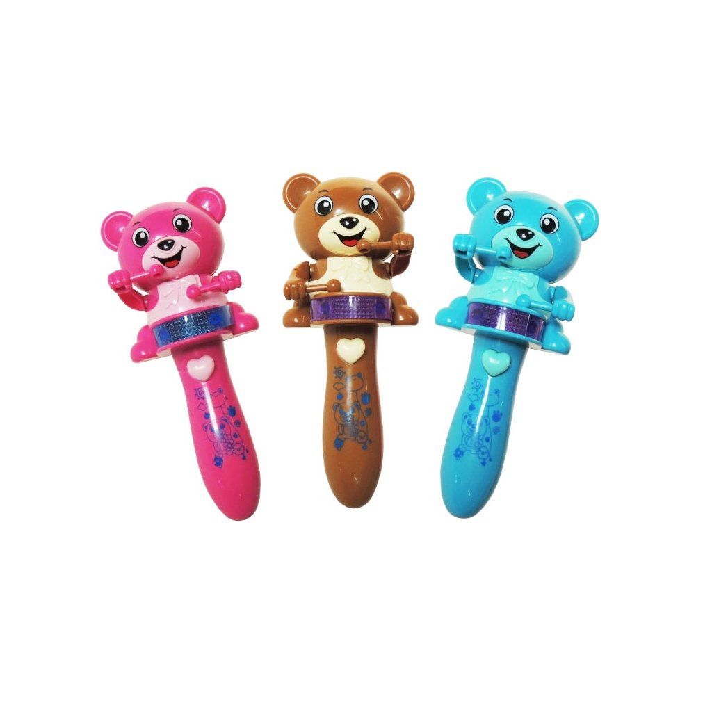 Veselý medvídek, který vykouzlí úsměv na každé tvářičce. Po stisknutí tlačítka ve tvaru srdíčka se medvídek rozbubnuje, buben rozsvítí a rozezní se melodie. Hračka vyžaduje 2ks 1,5V baterií typu AAA, které nejsou součástí balení. Možnost výběru ze tří barev. Výška - 16cmDoplňkové parametry