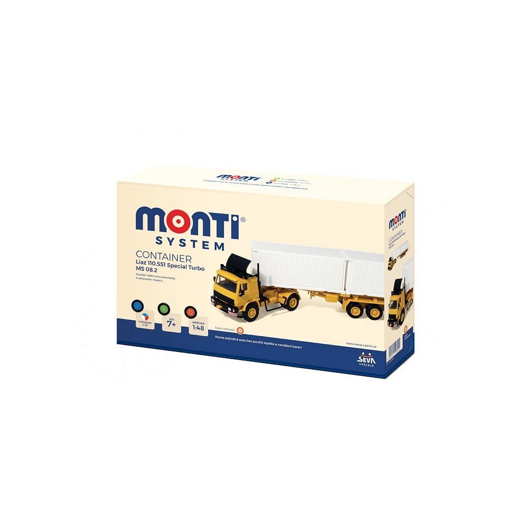 Monti System MS 08.2 - Container Modely z řady STANDARD jsou více detailnější a tím pádem obsahují více dílků. Počet dílků se pohybuje přibližně kolem 50. I přesto jsou modely řady STANDARD stále jednoduché na složení a zvládnou je sestavit děti od 6 let. Auta se vyrábí v měřítku 1:48.Doplňkové parametry