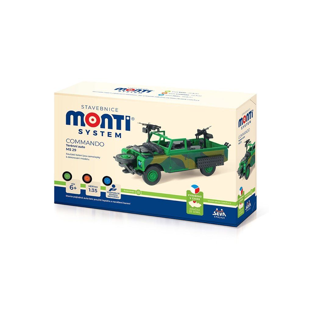 Největší výhodou těchto stavebnic je, že k sestavení modelu autíčka nepotřebujete žádné lepidlo a barvy. Jednotlivé dílky jsou tak důmyslně vyrobeny, že s pomocí různých zacvakávacích zámků, úchytů a dalších pružných mechanismů sestavíte model bez jediné kapky lepidla. Vše do sebe jen zacvaknete nebo zasunete. Výsledkem je funkční model s úžasnými detaily, který je dokonalou replikou skutečné předlohy. Jednotlivé dílky jsou lisovány již barevné, takže nemusíte nic barvit. Navíc jsou některé dílky pochromované a u nových Monti Systémů mají některé stavebnice pro ještě realističtější vzhled gumová kola. V každém balení naleznete také samolepky, kterými si složený model můžete polepit.Modely z řady BASIC a STANDARD zvládnou sestavit děti od 6 let. Monti System s označením PROFI je stavebnice s větším počtem dílků a jeho sestavení zabere více času. Tyto modely jsou určeny pro děti od 8 let. Monti System je oceněná, poctivá a kvalitní česká stavebnice, kterou uděláte radost nejen svým dětem, ale určitě i dospělým. Z nabídky si bez pochyby vybere každý fanda autíček. Nabízíme šíroky sortiment, ze kterého si můžete postavit závodní nebo vojenský speciál, autobus, ambulanci, hasiče, policii, přepravní kamiony, tahače, cisterny, nákladní auta a další úžasné modely propracované do posledního detailu.
