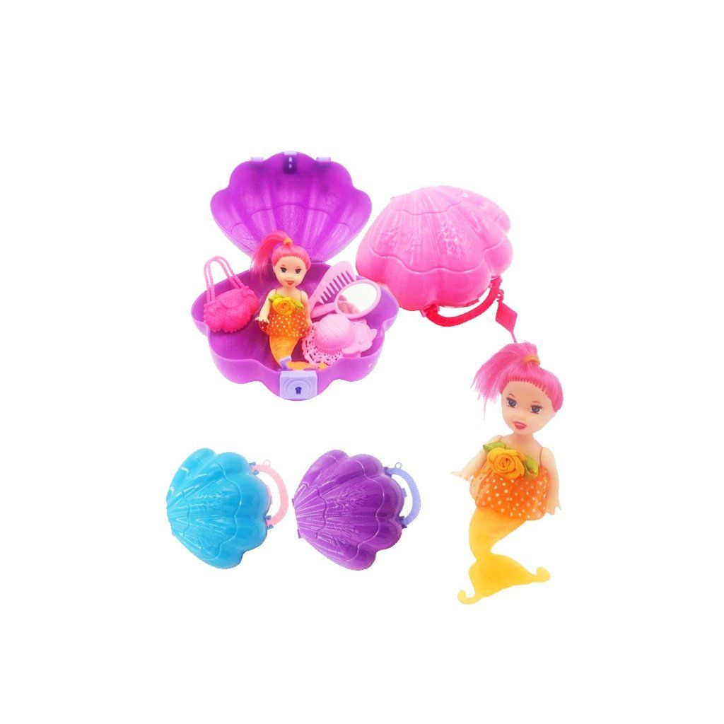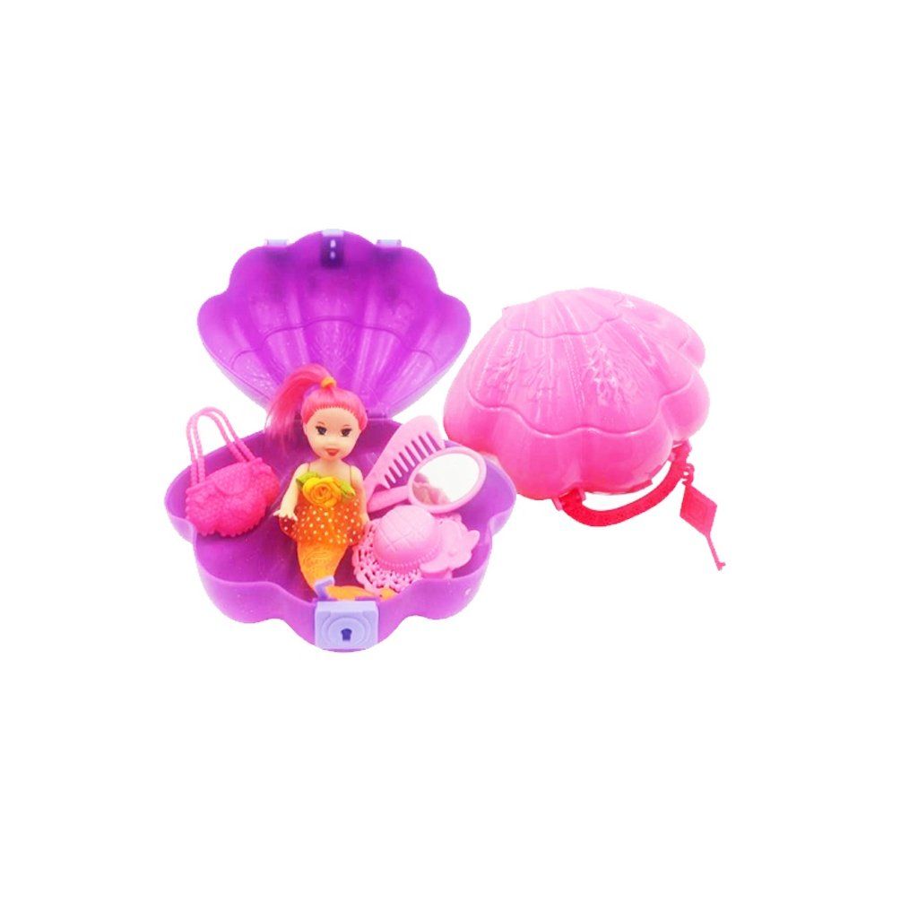 Plastový kufřík ve tvaru mušle s panenkou do auta na dlouhé i krátké cesty. Balení obsahuje - mořskou pannu, klobouček, zrcátko, hřebínek, kabelku a klíček. Možnost výběru ze tří barev ? růžová, fialová nebo modrá. Nevhodné pro děti do 3 let.Výška panenky - 13,5cm