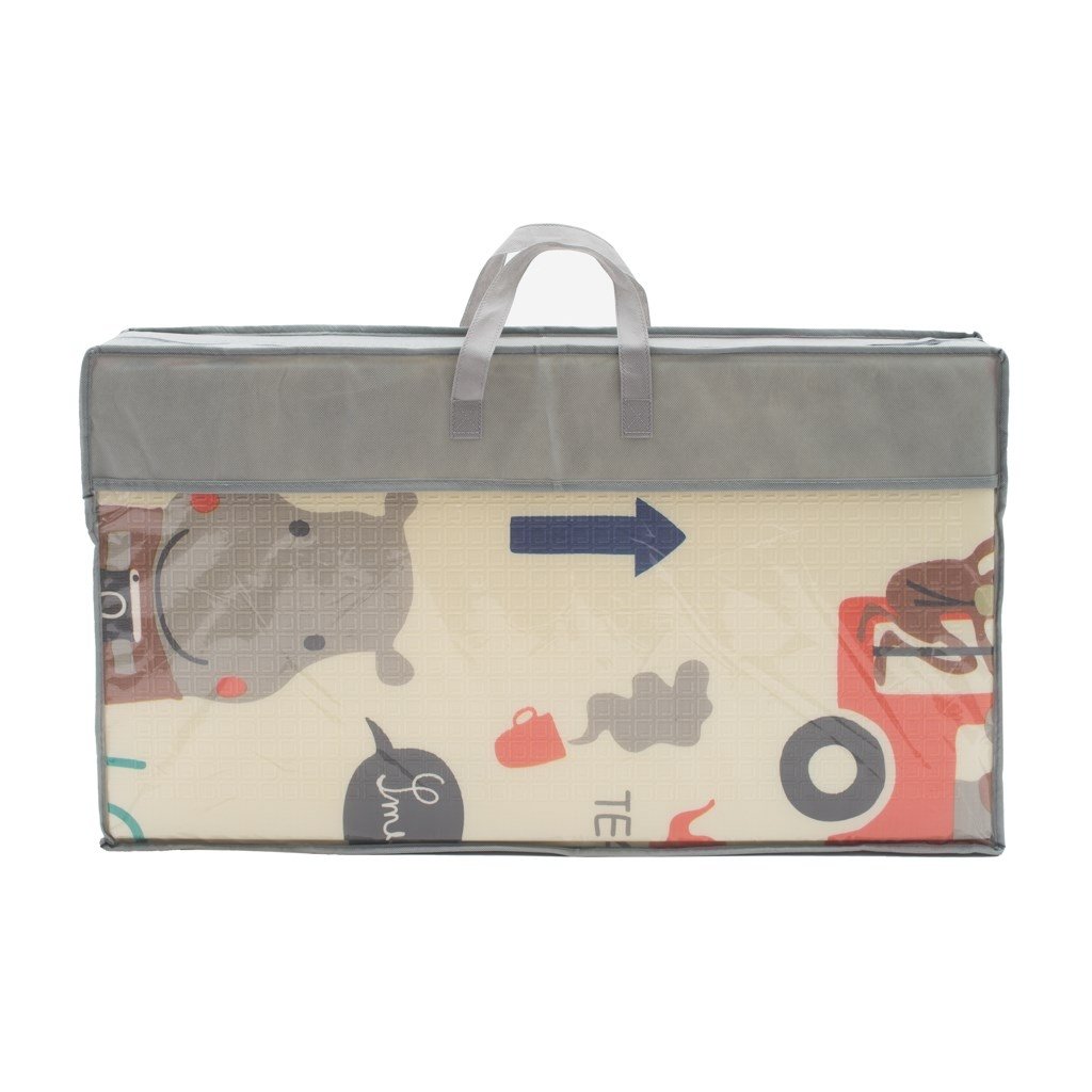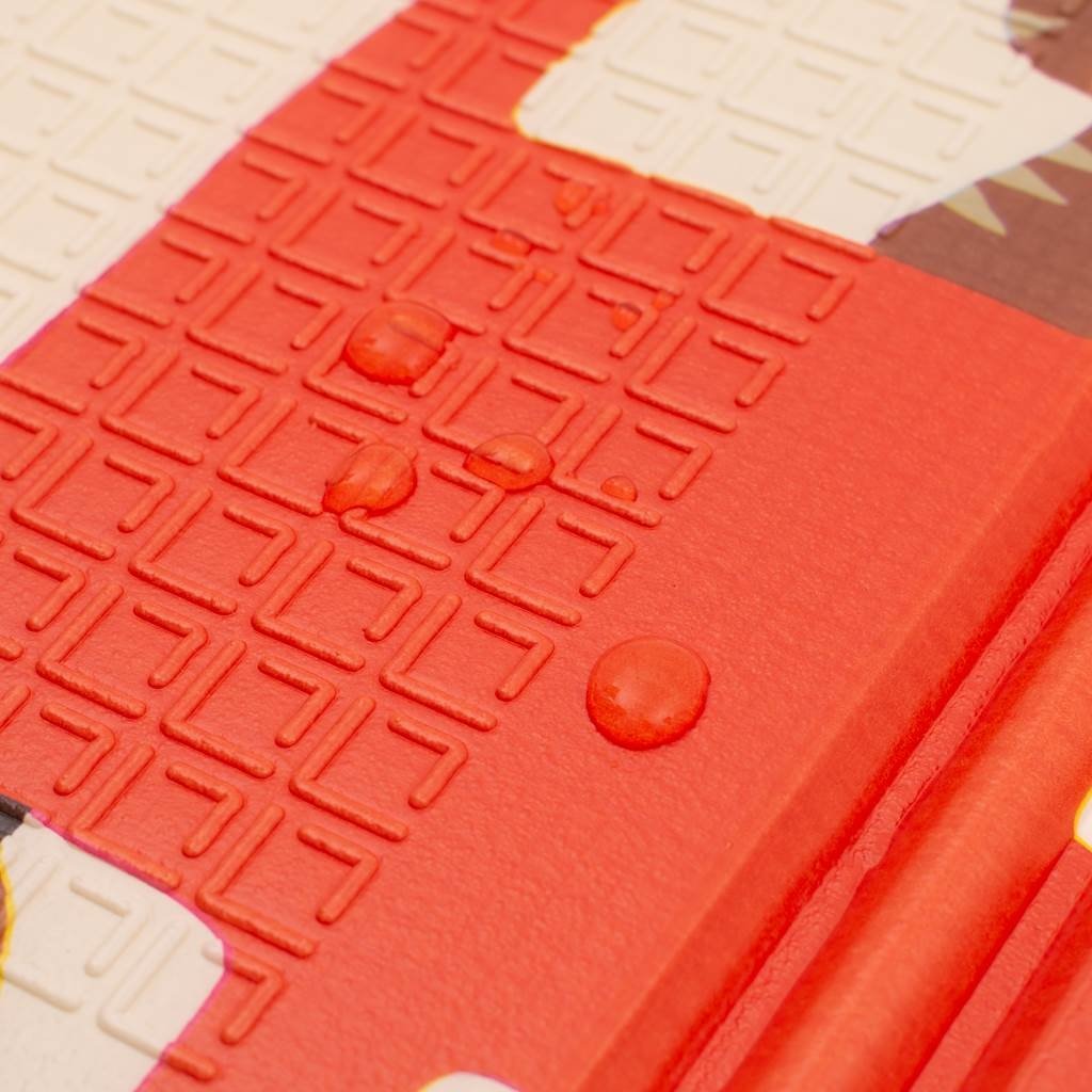 Podložka má opravdu úctyhodné rozměry 200x150 cm ovšem po složení má rozměry pouhých 70x40x10 centimetrů a snadno jej sbalíte do praktické tašky, v niž je podložka dodavána. Je certifikována dle normy EN71 jako hračka a tím splňuje přísnější požadavky než některé konkurenční podložky co se týče bezpečnosti, materiálového a chemického složení.